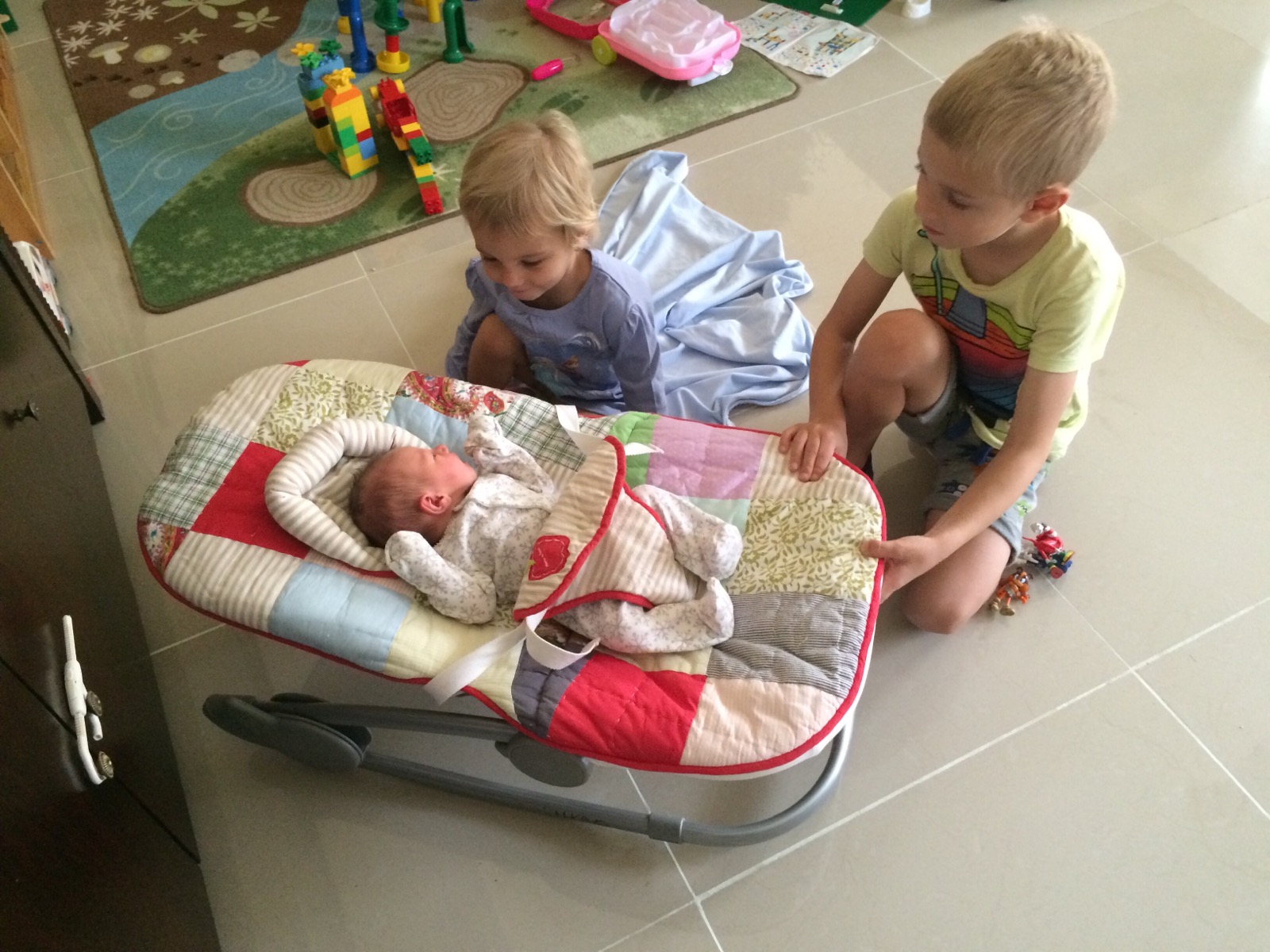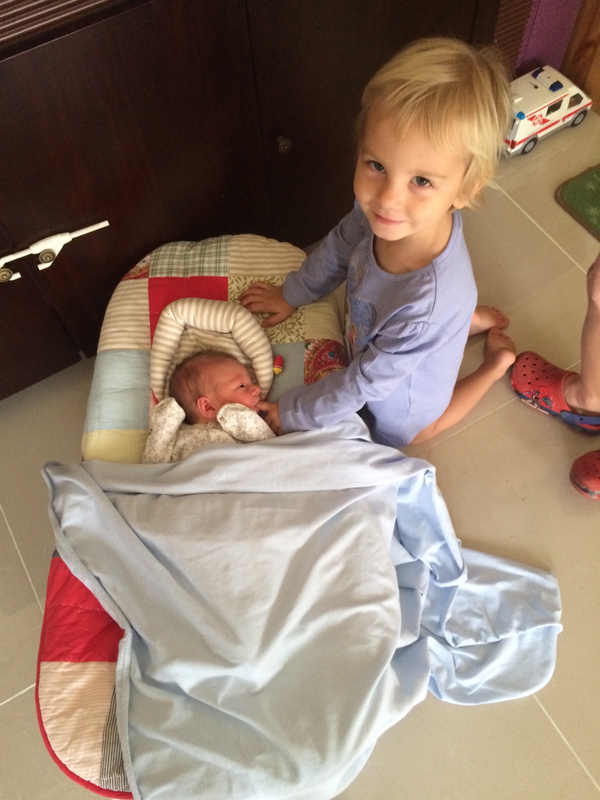Theuška se Sárunkou se na ni strašně těšili a i teď z ní ještě mají radost :). Asi ne víc než z najednou funkční chůvičky, lehátka a malých plíneček, které s trochou tolerance sedí i panenkám, ale prostě takovou přirozenou radost, že je naše, že je jejich. Jen ten osekanější režim… to jim moc nejde. Ale neublíží jim, seznámit se, sžít a sladit se potřebujeme všichni.