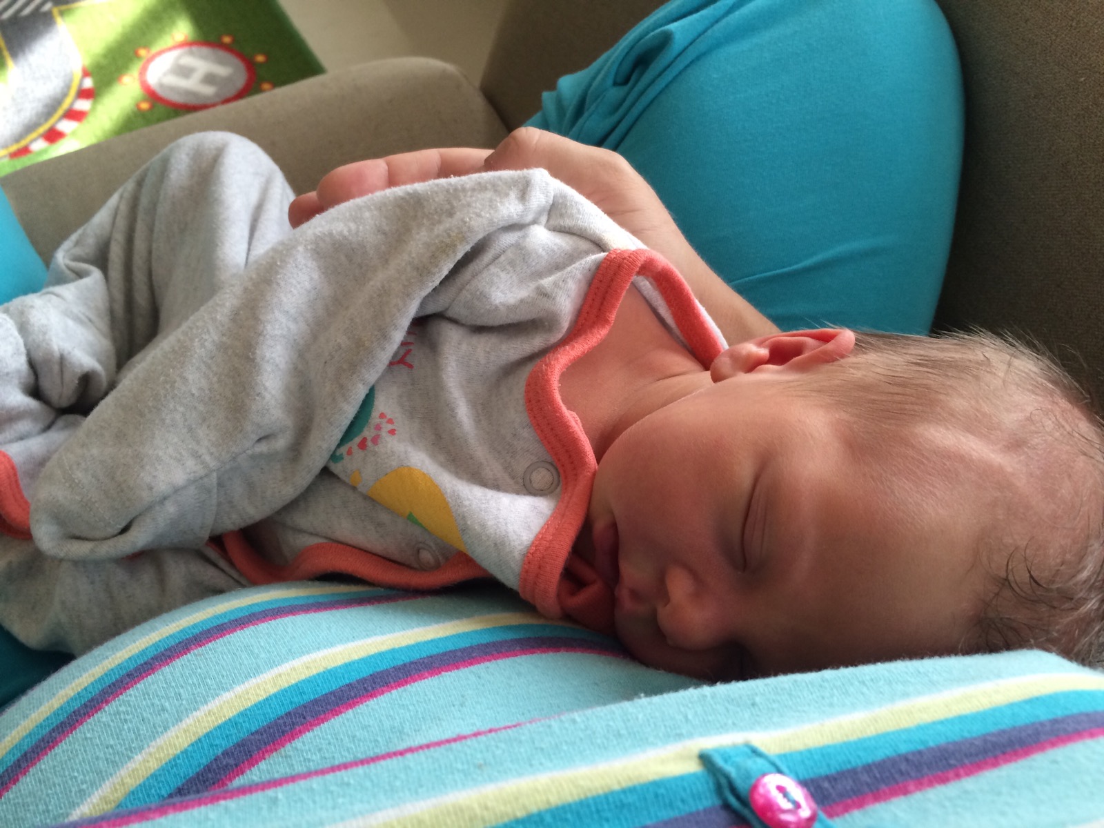 Je neskutečně klidná a spokojená – tedy zatím, ale rozhodně už déle než to vydrželo Sárunce :-D. Výborně se kojí, za první týden dokonce 100 gramů přibrala! I žloutenka se jí v podstatě vyhnula, trošku ji má každé miminko, ona byla nažloutlá maximálně půl dne.