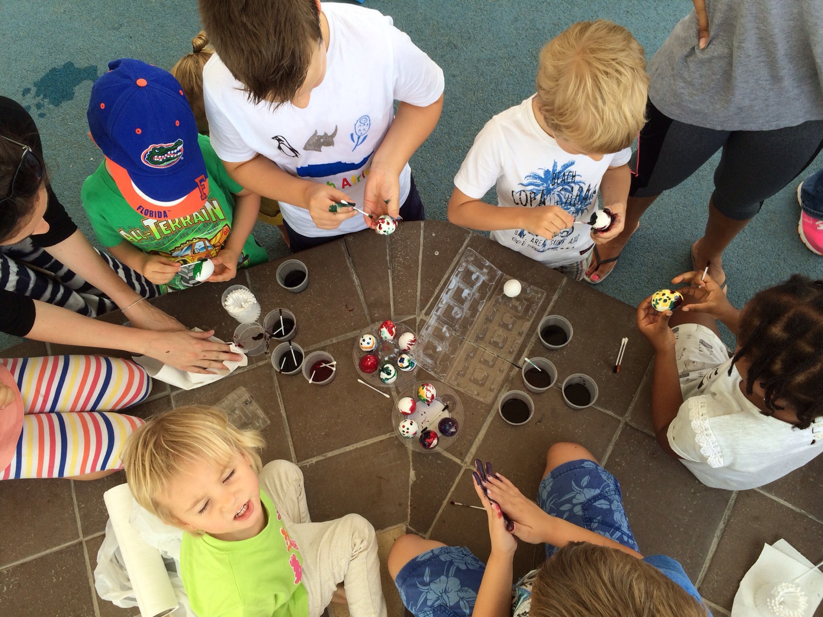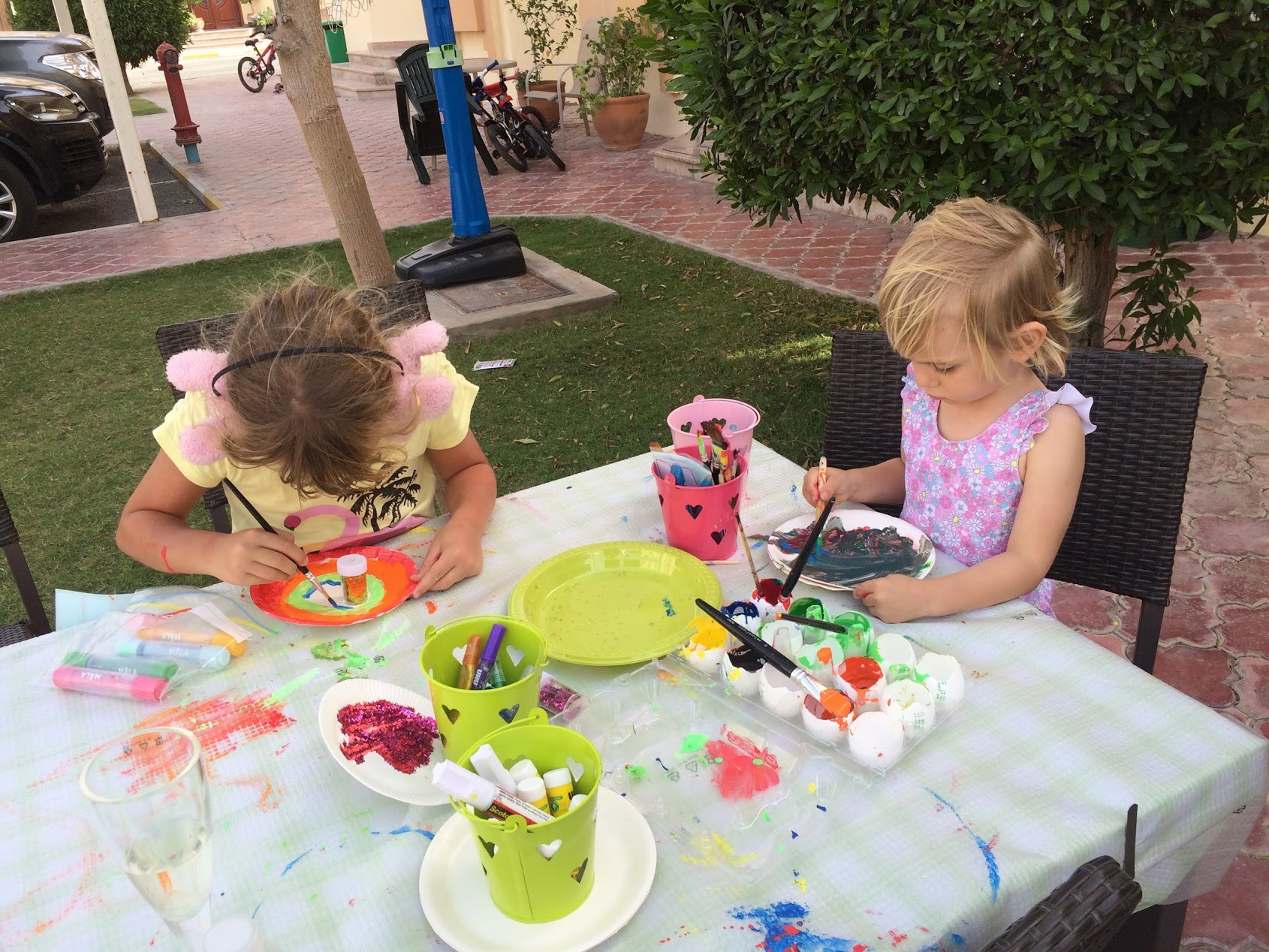 Ale zpět k Velikonocům, draky tu neuvidíte. Tady začínáme vyráběním a hrami. Motto dne: čisté, suché a neupocené děti bez úsměvu od ucha k uchu nevracíme.