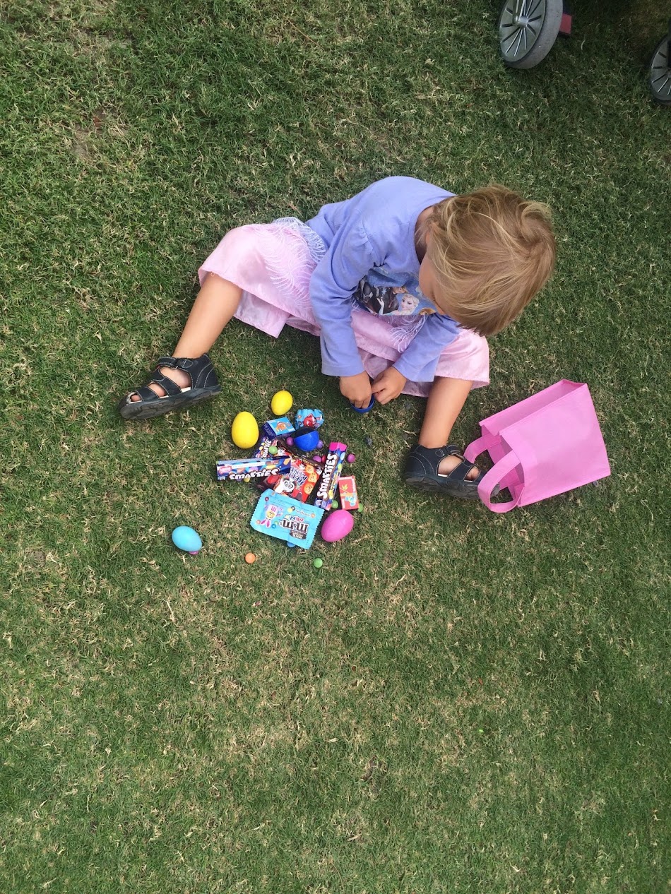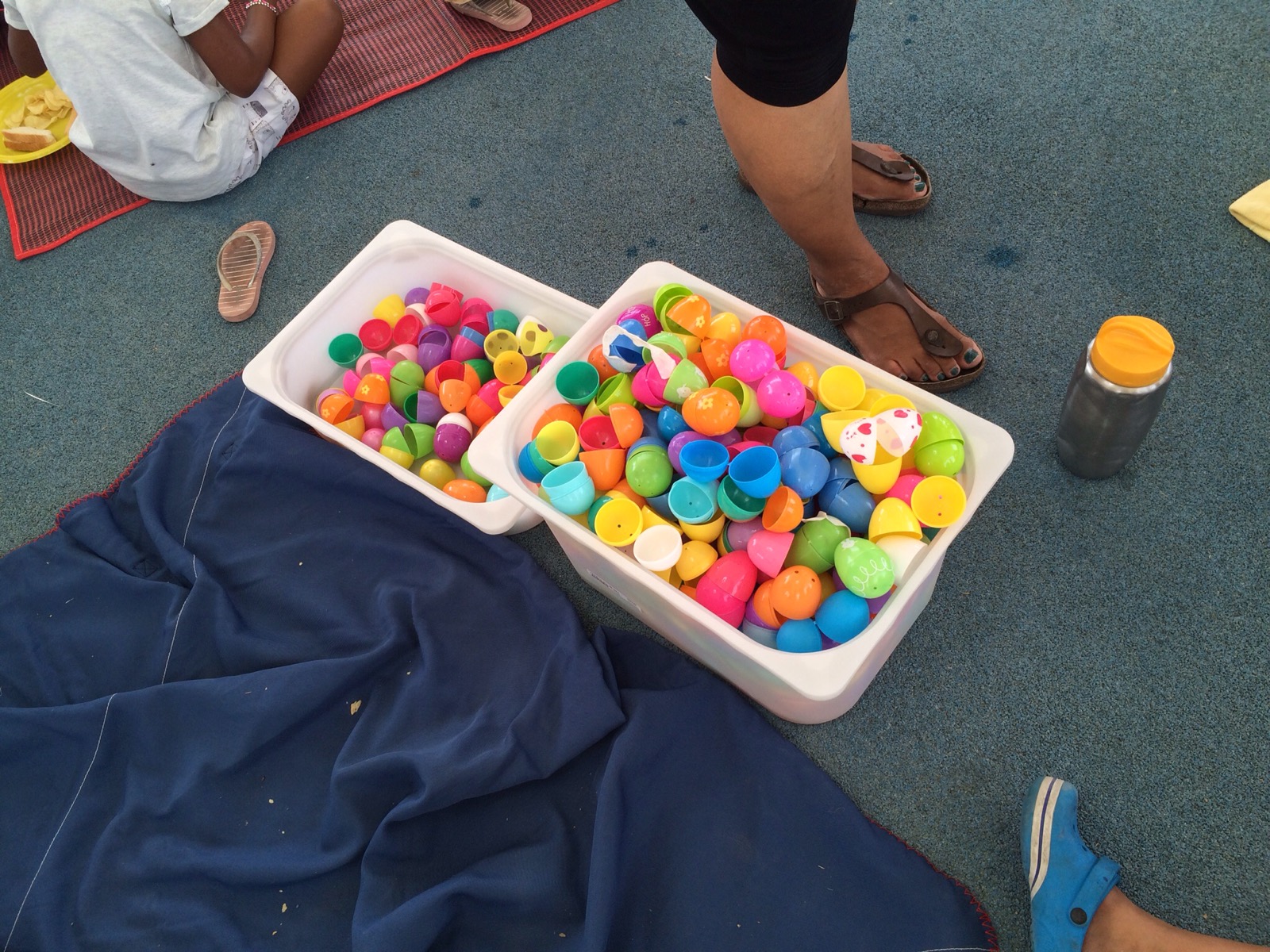 Přebírání pokladů :). Největším hitem byly píšťalky pro kluky a prsteny pro holky (které dostali v taštičkách na sbírání vajíček už předem ehm).