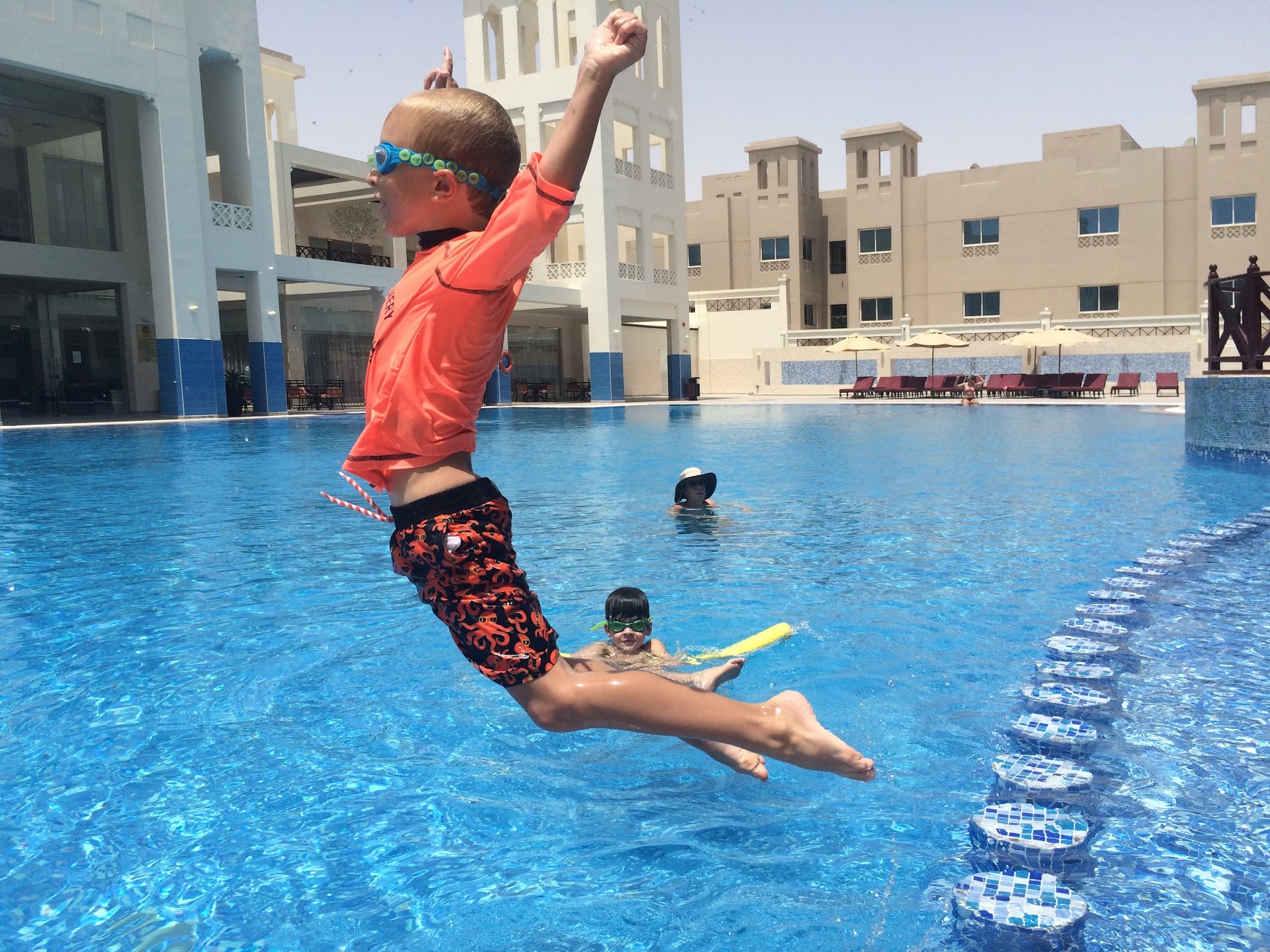Plavání je spíš taková dovednost, kterou by měl asi zvládnout každý. Alespoň špatně! Ale radši dobře, když má u domu bazén a 6 měsíců v roce se nedá venku dělat nic lepšího :-). Theo plavání miluje! Hlavně skákání a potápění, různé kotrmelce a triky. A i když ty styly ještě chvíli potrvají, už teď není potřeba tak ostříží hlídání ani plaveckých pomůcek.