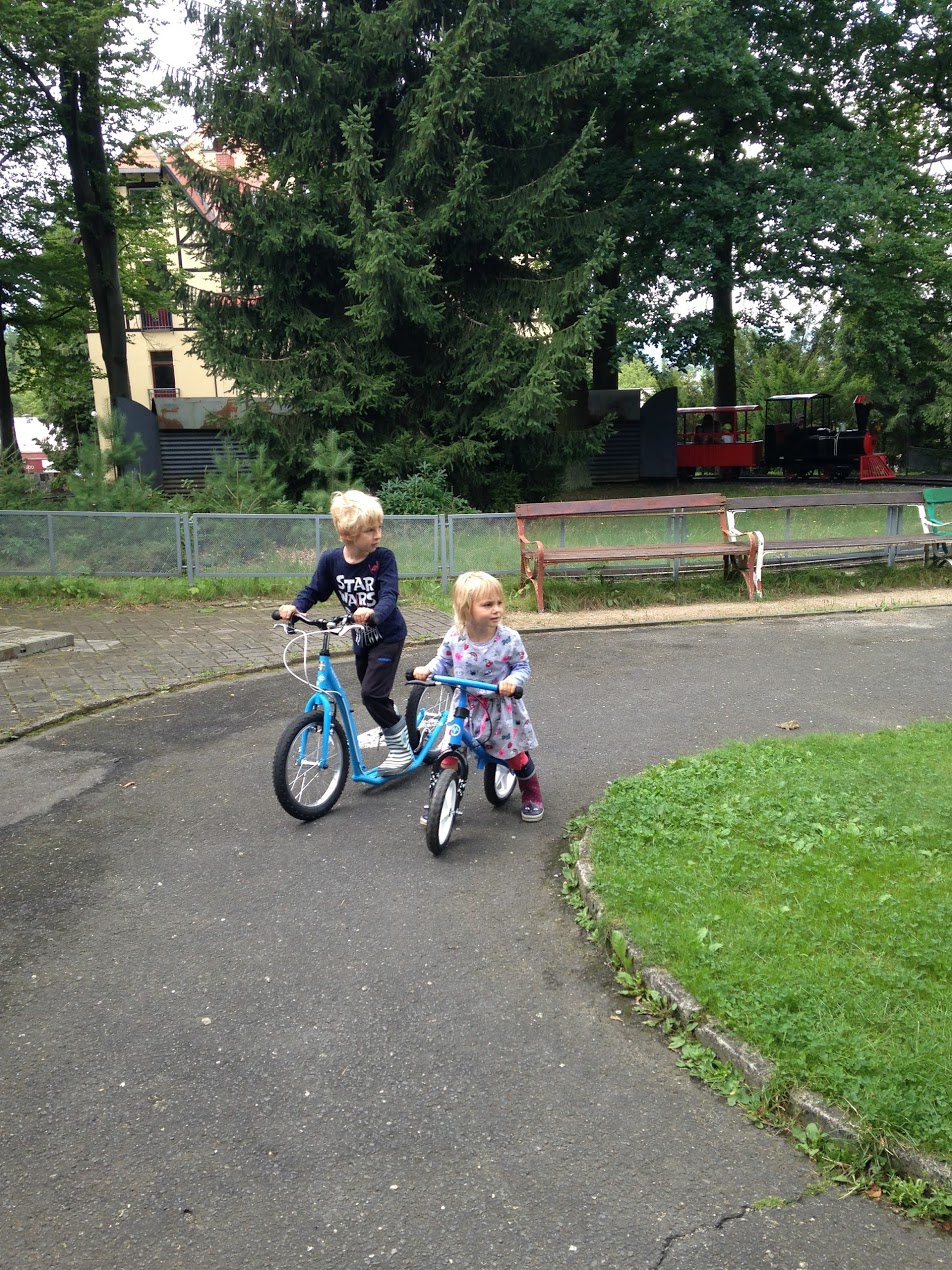 Liberecké výletování jsme završili v Dětském koutku (kde jsme nebyli, fjůůů, ani nepamatuju) a tentokrát jsme tu byli skoro sami. Takže žádný problém poprosit u pokladny, aby nám pustili ruské kolo dvakrát po sobě, všechna kola a vozidla k dispozici a tak podobně. Sárka na potkání vyprávěla, že tyhle šaty (co nosila další 3 dny v kuse) dostala od babičky za to, že byla v nemocnici statečná…