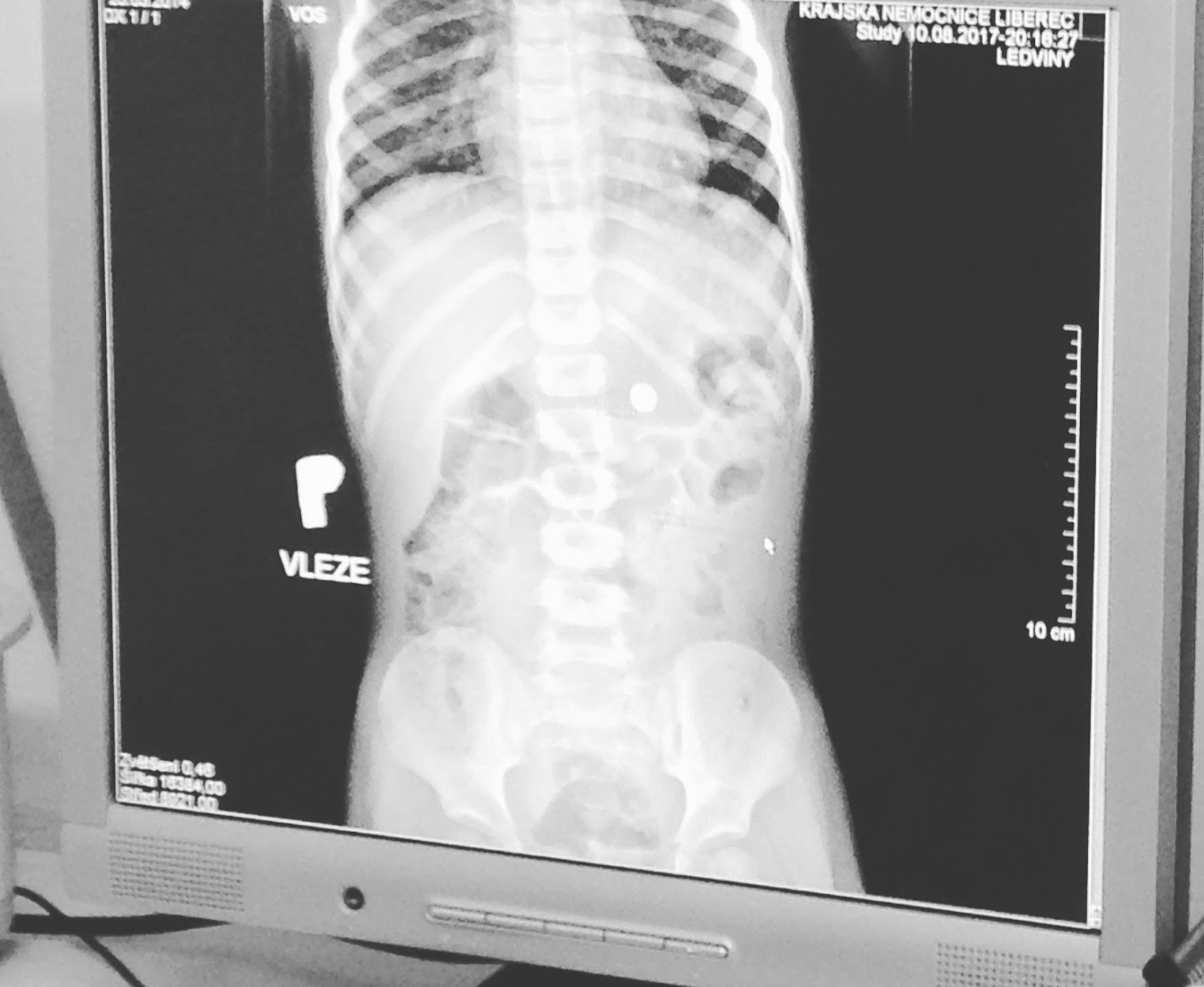 Krev je v pořádku a i “cvak” (druhý rentgen v životě) si nechá Sárunka nadšeně udělat. A baterka je v tlustém střevě, takže můžeme domů :). Jíst, odpočívat, kakat. Uuuuf. Pokud by se baterka neobjevila, kontrolní rentgen za týden.