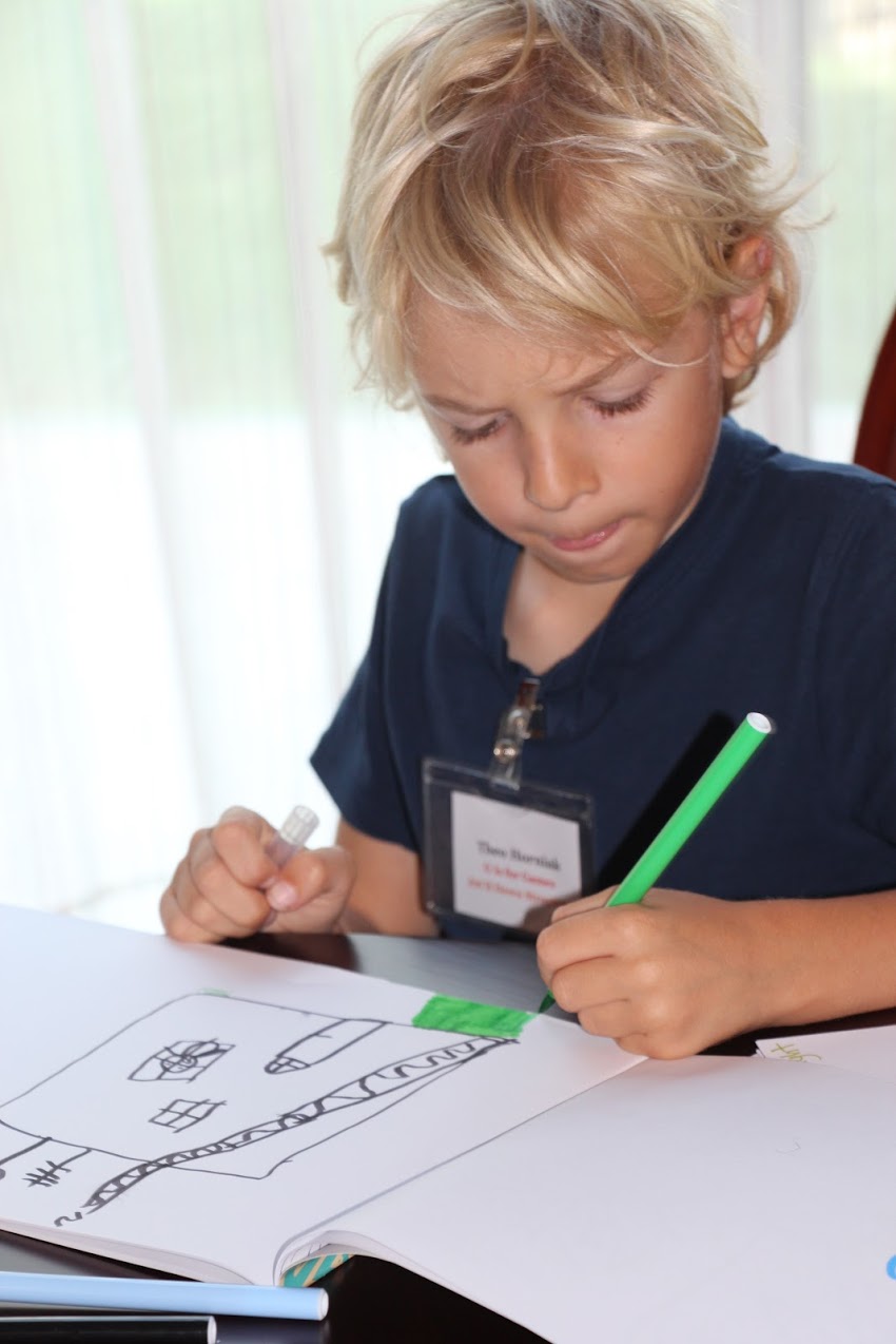 Theovi jsem jednoduše přečetla všechny nabízené kurzy pro Youngers (5-8 let) a nevěřila jsem vlastním uším, když si vybral Games (popisované především jako deskovky a hlavolamy) a Story Time (čtení s kreslením čtenářského deníku). Že bych mu to zapsala do českého školního portfolia tedy nehrozilo (pod čím bych to tak asi uvedla :-D), ale zase bylo asi potřeba mi připomenout, že jeho priority jsou pochopitelně jiné, není to žádná škatule :-). A tak chodil na svoje games a story time, kreslil, hrál, poznal nové kamarády… a pěl ÓDY na to, jak ho to strašně baví. Vlastně se nedivím :). Jeho kreslený deník je ovšem něco na památku :-D.