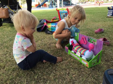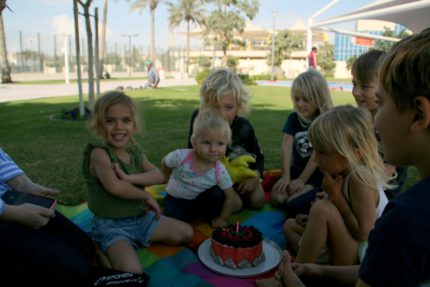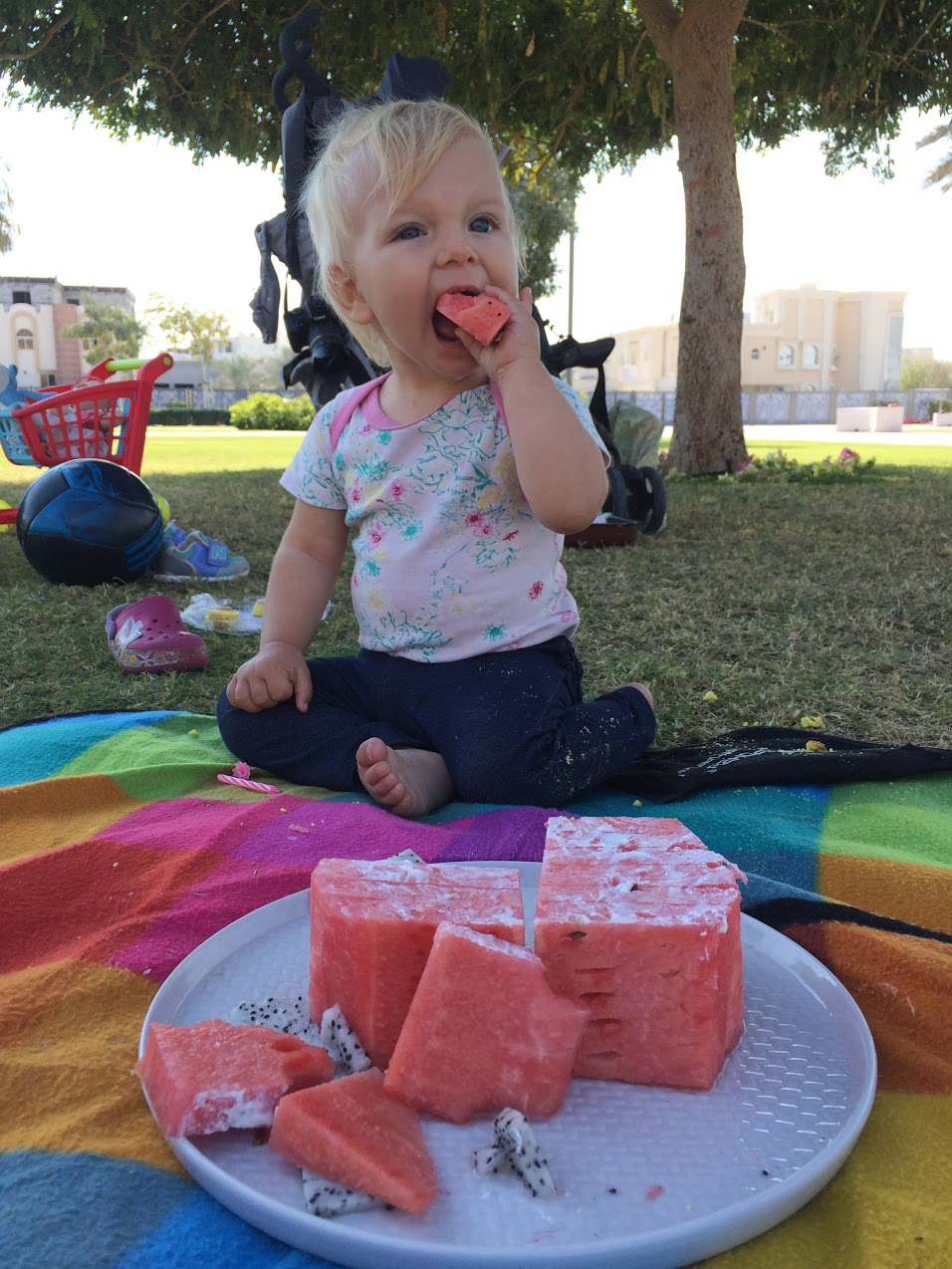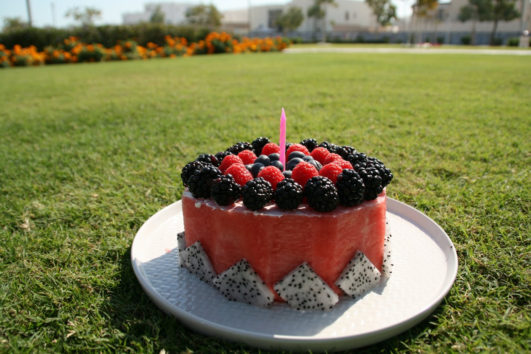 A můžeme jít na dort! Melounový s ostružinami, malinami, borůvkami a dragonfruit. Ňam ňam ňam. Akorát svíčka nám hořela asi pikosekundu, protože vítr, no. Ne že by ji Zojinka uměla sfouknout :-D.