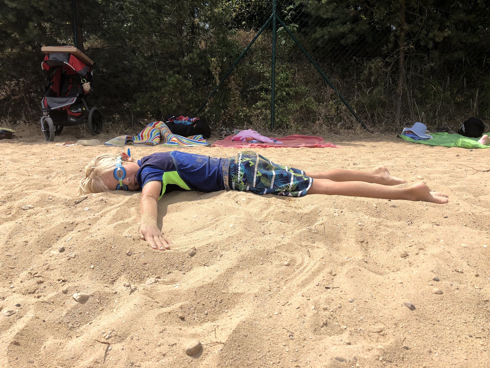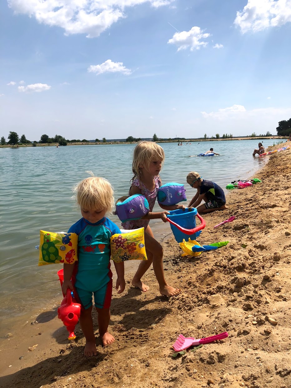 Horký víkend jsme pak věnovali balení a výletu na pískovnu v Konětopech. Do vody sice děti pořádně nevlezly, protože byla ledová!! Ale placatění se na písku jim vždycky pozvedne náladu. Navíc jsme došli k tomu, že oproti moři má i ten vobyčejnej pískáč pár výhod! Neni to slaný :). Nejsou tam prakticky žádné vlny. A člověk nemusí hlídat příliv. Tak tam asi pojedeme znova.