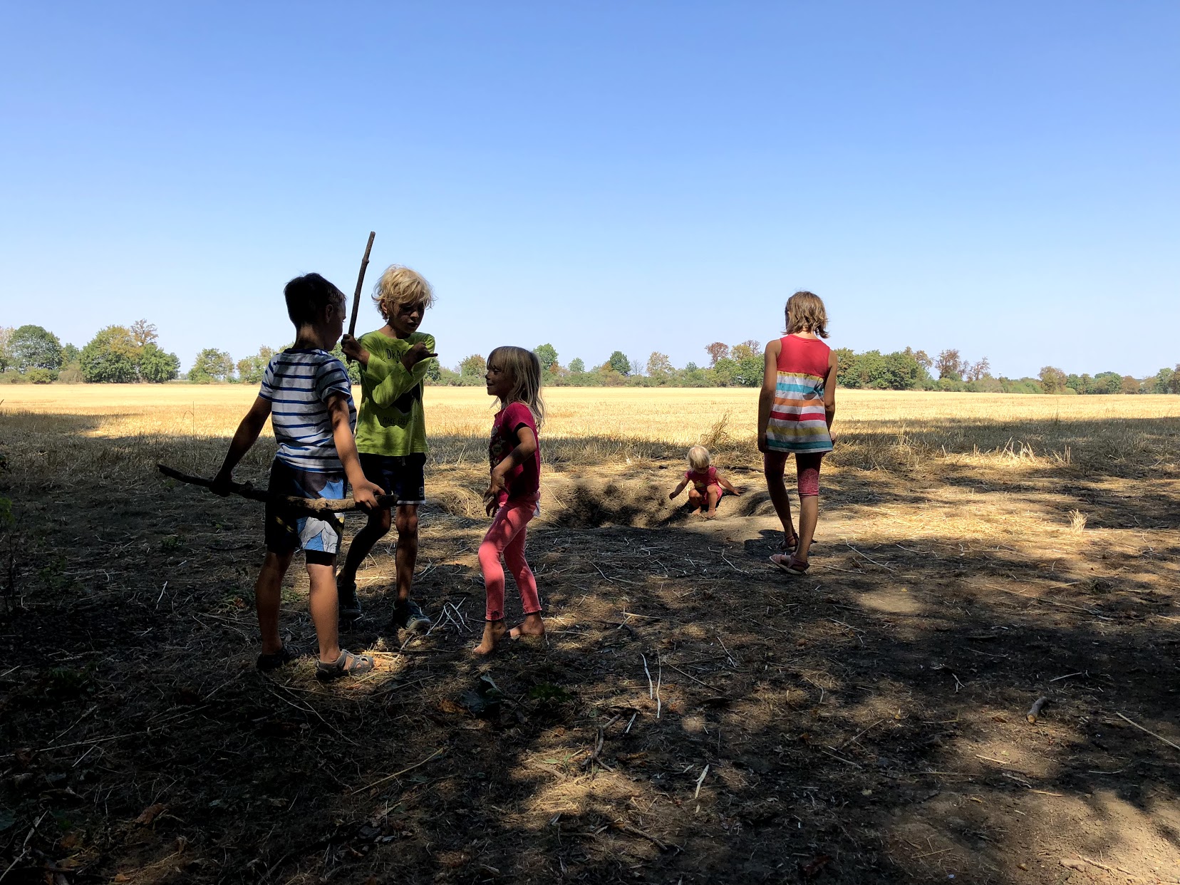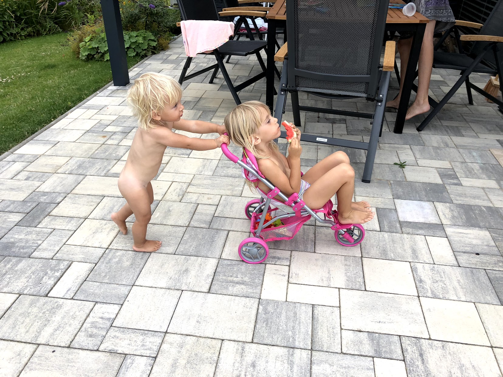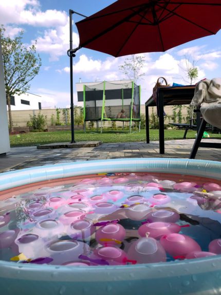 Následující týden už se teploty přes 30 stupňů nemaskovaly za oblačno, takže voda a stín byli naši nejlepší kamarádi. Osprchovat trampolínu, napustit malý bazének, přelívat vodu v kuchyňkovém nádobí, nanuky.