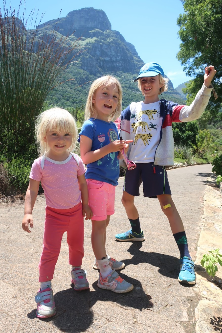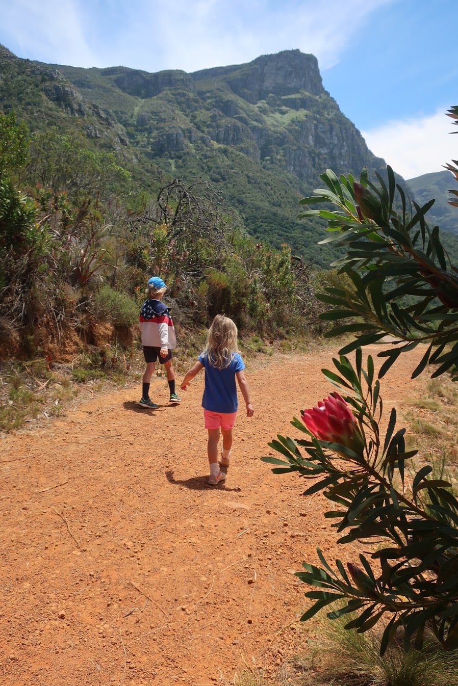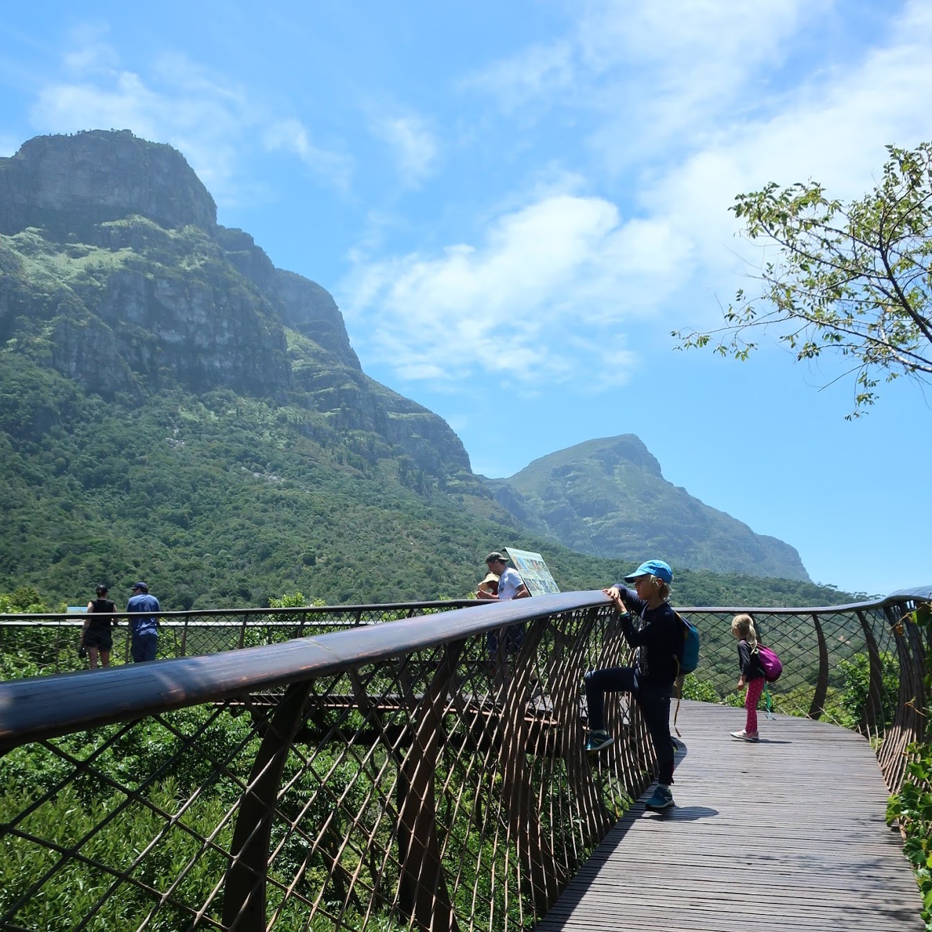 Do botanických zahrad jsme pak vyrazili pěšky tůrou přes úpatí Stolové hory, a to stezkou, která začíná přímo nad Schoestattem. Krásná cesta se vine částečně lesem a pak holými skalami na ostrém slunci, až nakonec splyne s horní částí zahrad Kirstenbosch. Jak jsme se mimo les mále upekli, tak v zahradách je parádní stín a v protékajícím prameni si nejen děti vydrží hrát hodiny! S vodou, kameny, pulci, žábami, krabíky, blátem, listy. Hodiny! :)) Že jsou tam vzácné pravěké stromy a všechny druhy národních proteí tak lehko unikne jejich pozornosti.