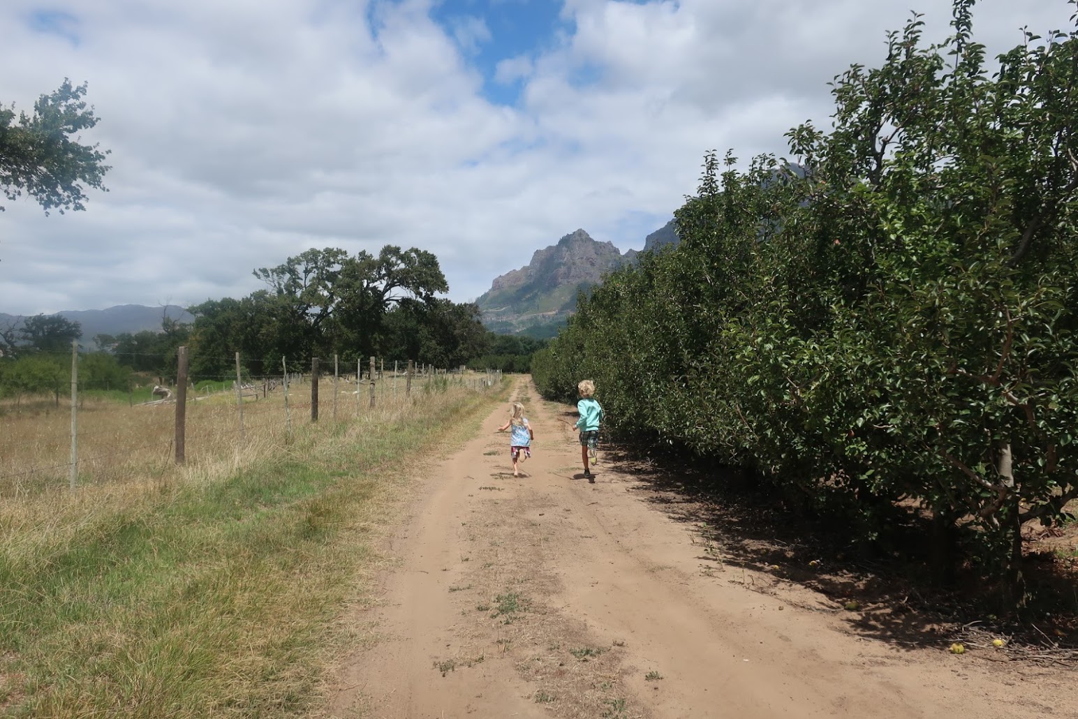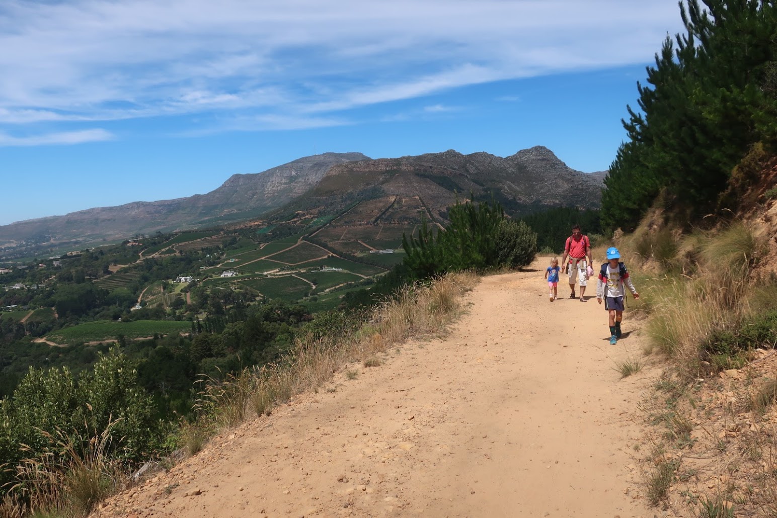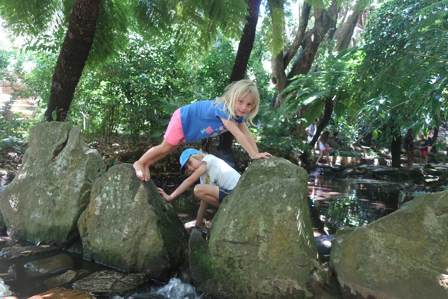 Do botanických zahrad jsme pak vyrazili pěšky tůrou přes úpatí Stolové hory, a to stezkou, která začíná přímo nad Schoestattem. Krásná cesta se vine částečně lesem a pak holými skalami na ostrém slunci, až nakonec splyne s horní částí zahrad Kirstenbosch. Jak jsme se mimo les mále upekli, tak v zahradách je parádní stín a v protékajícím prameni si nejen děti vydrží hrát hodiny! S vodou, kameny, pulci, žábami, krabíky, blátem, listy. Hodiny! :)) Že jsou tam vzácné pravěké stromy a všechny druhy národních proteí tak lehko unikne jejich pozornosti.