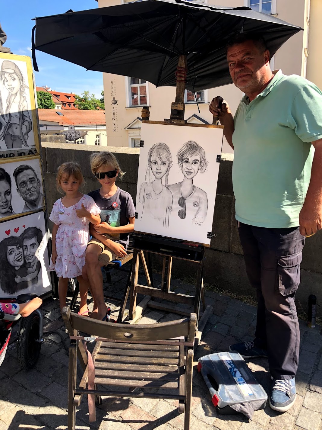 Aby turismu nebylo málo, máme ještě z Karlova mostu karikatury! A máme z nich vlastně nakonec radost. Zojáček to prospala, tak obrázek nemá, ale u ní člověk stejně neví, jestli by způsobně seděla portrétem nebo se snažila skočit po hlavě do Vltavy. Tak časem.