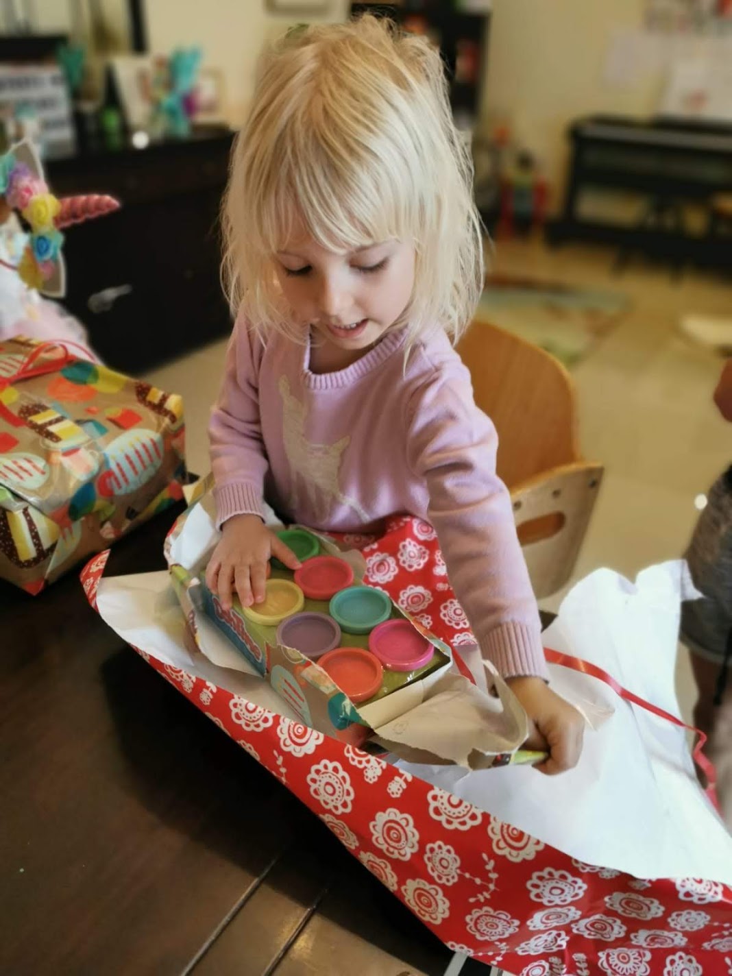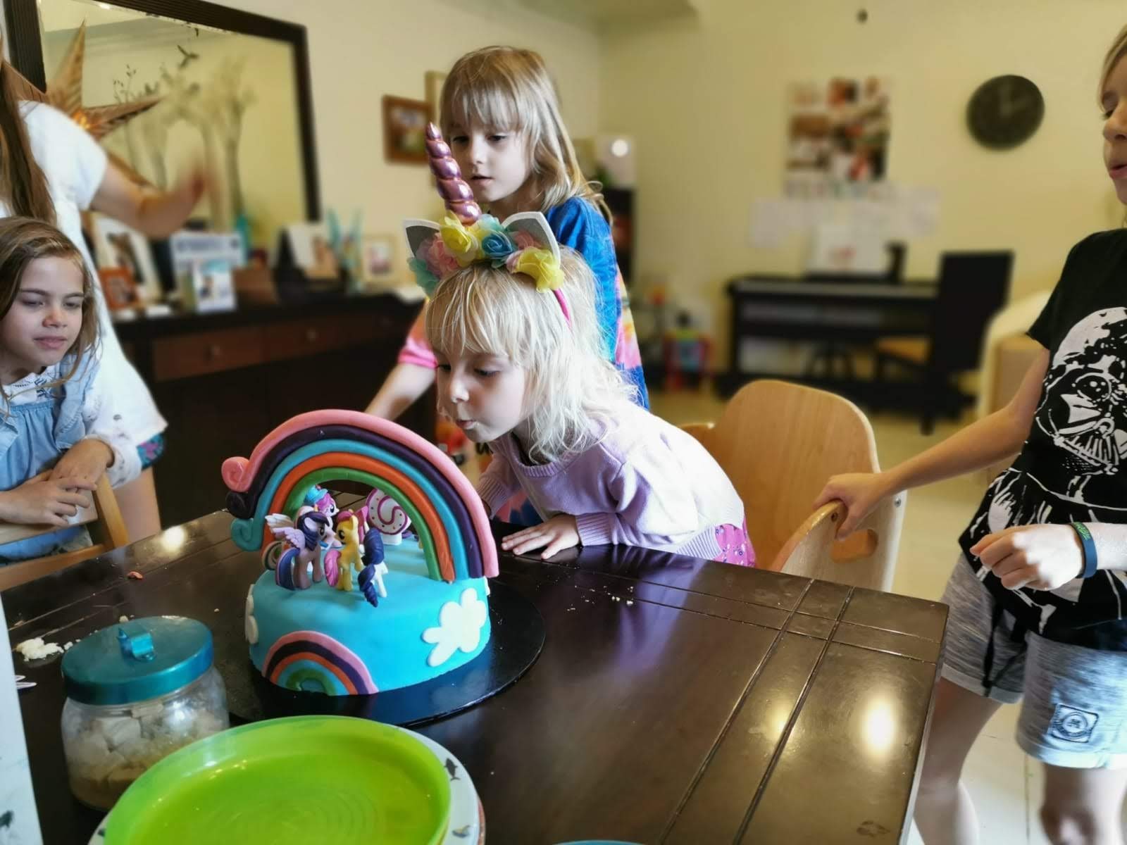 Narozeninová oslava proběhla v rodinném kroužku, jen pár jejích nejmilejších kamarádů se přes den zastavilo. Hráli jsme si s playdoh, koukali na My Little Pony Movie, pouštěli do nekonečna bublifuk, jedli pizzu a dort… na co velkou oslavu, když máš (relativně) velkou rodinu :).