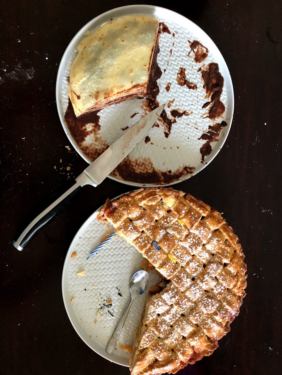 Dort mi rovnou hlásil, že nechce “ten sladký” (s fondantem), tak jsem mu upekla mřížkový koláč s jablky a ostružinami a palačinkový dort (což je hromada palačinek slepené nutelou!! – na tom aspoň nelze co zkazit). Všechno se snědlo, ale požadavky na sladké od té doby nějak nejsou :-D.
