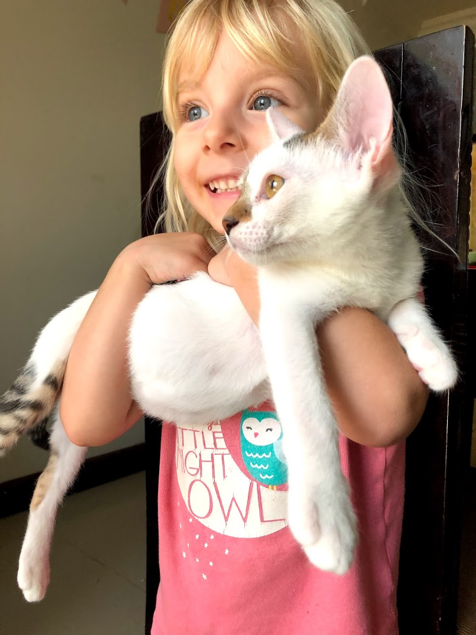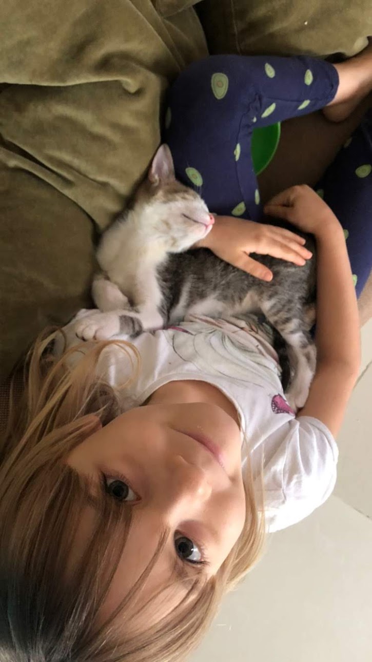 V březnu se někde na stavbě našla hromada koťat a přinešli je do útulku. Ten byl ale zavřený, a tak si dobrovolníci rozebrali zvěř aspoň domů (aspoň to, co šlo – opice, krávy, osel tam zůstali na distanční péči). A od takovéhle tety kočkonošky jsme si bezkontaktně přivedli naše přírůstky i my.