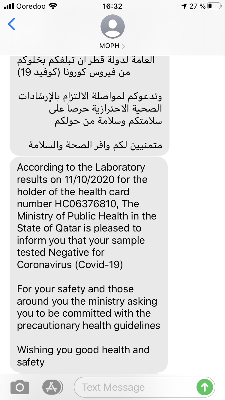 Druhý den ráno se můj Ehteraz zbarvil na žlutou a odpoledne dorazily SMSky s negativními výsledky stěrů a přáním pevného zdraví.