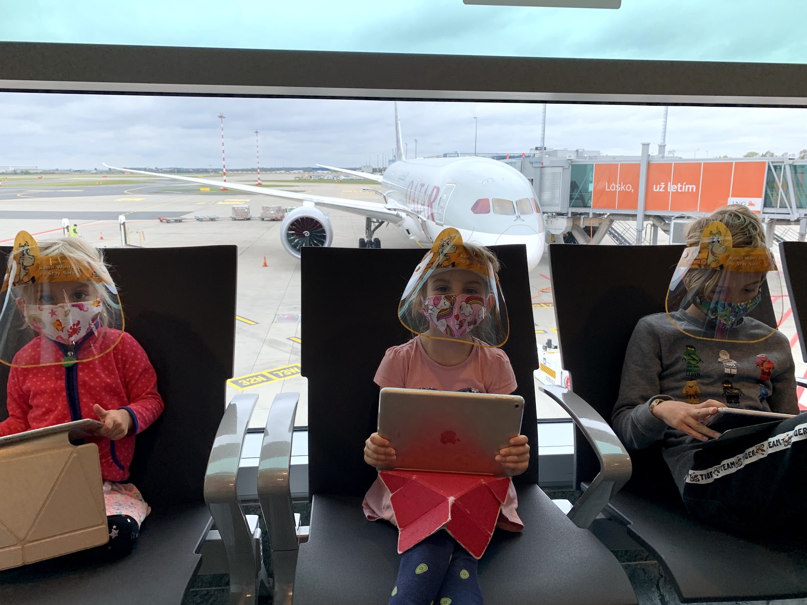 Všechno desetkrát zkontrolovali. Permity, závazek ke karanténě, identifikační karty, pasy, letenky. Odbavili jsme kufry a mrtvým letištěm jsme se sunuli na naši gate. Tady se není kde ztratit, ale znáte to: Čůrat. Můžeme si něco koupit? Mám žízeň! Je tady někde hřiště? Pojďte se honit!