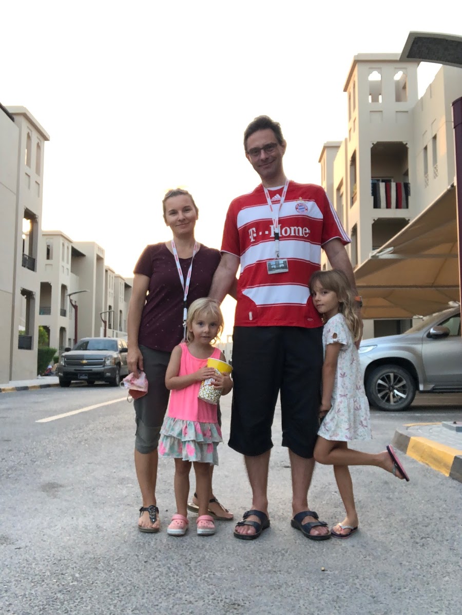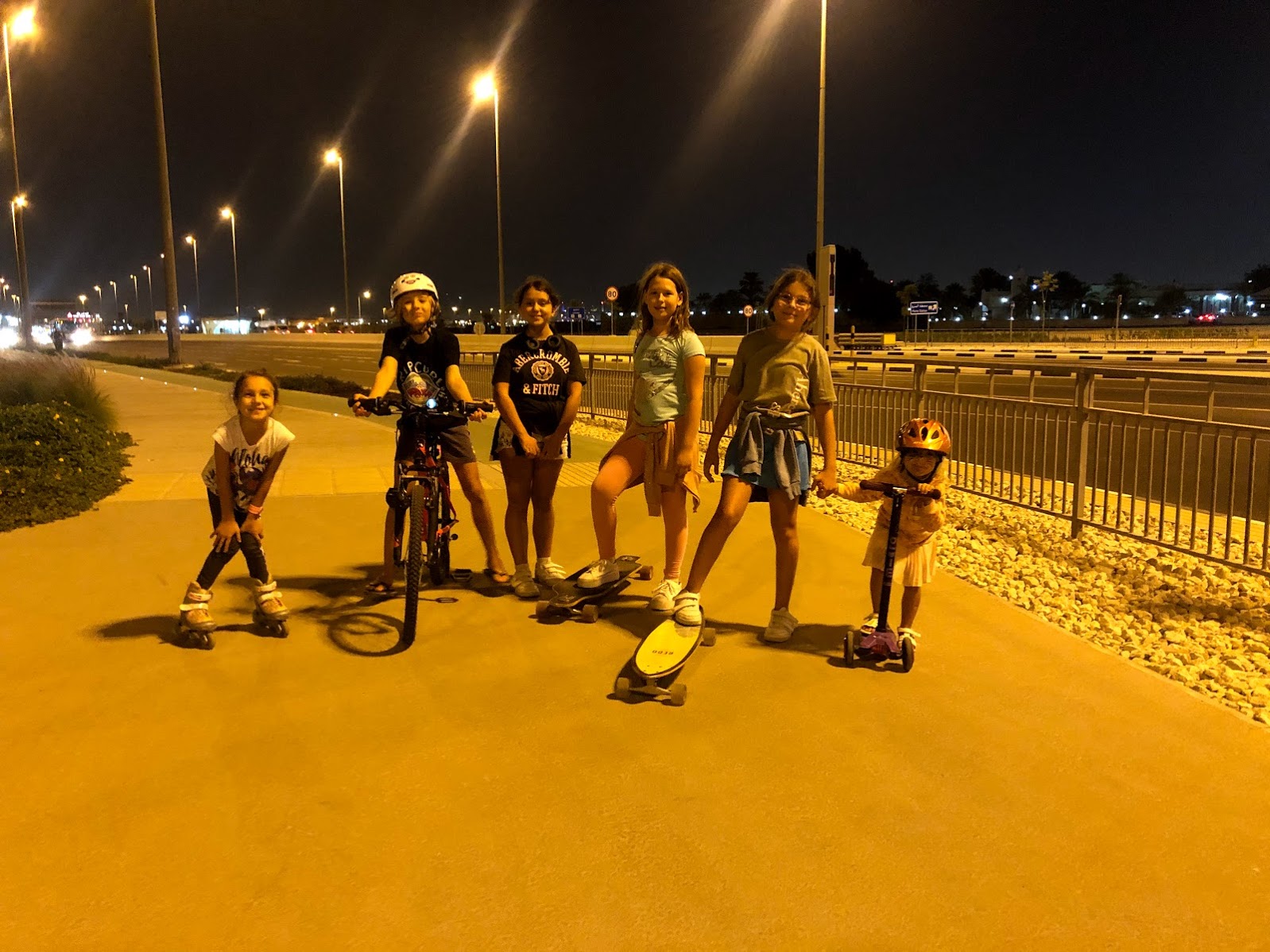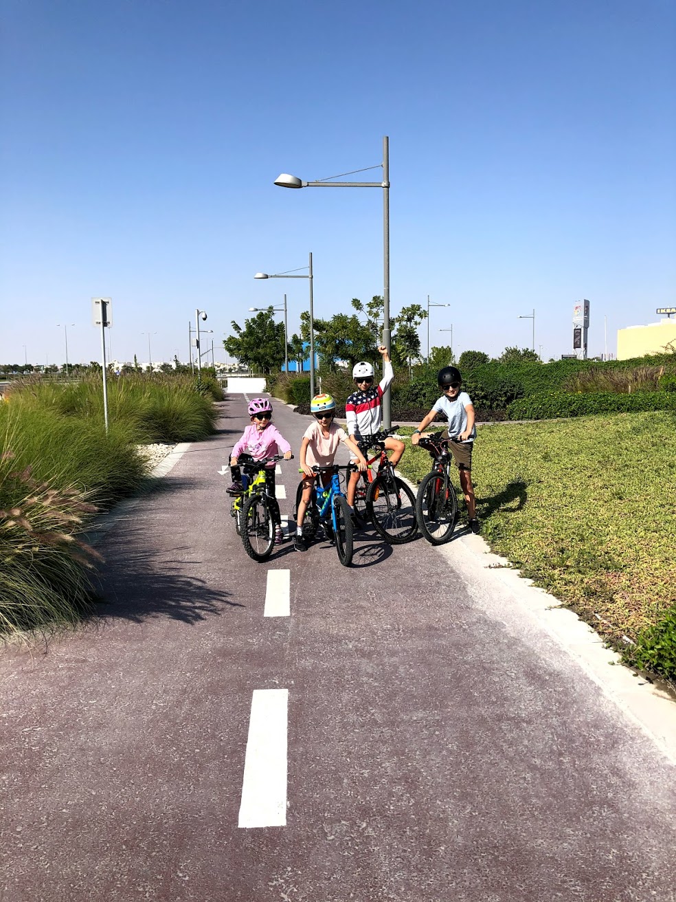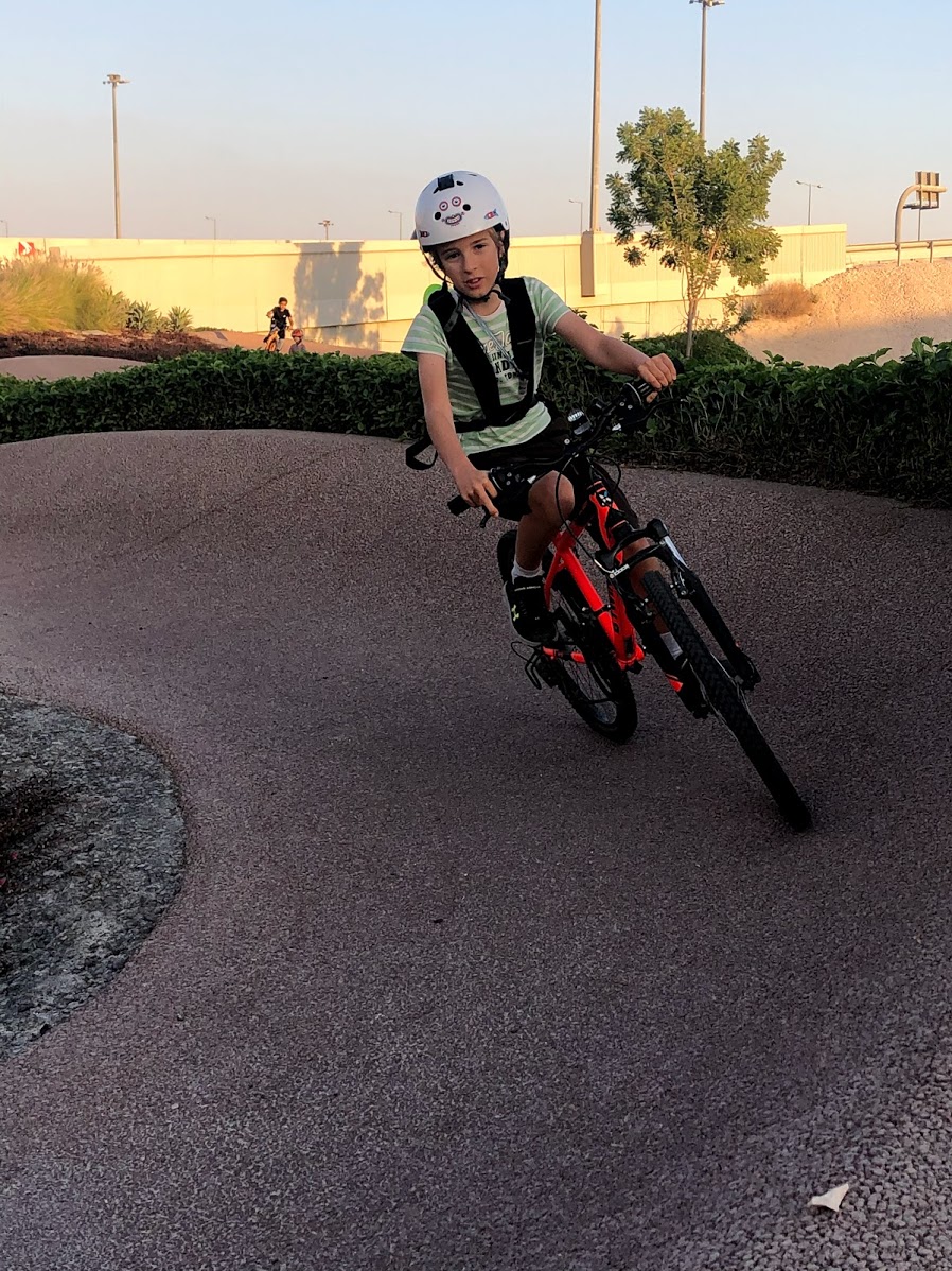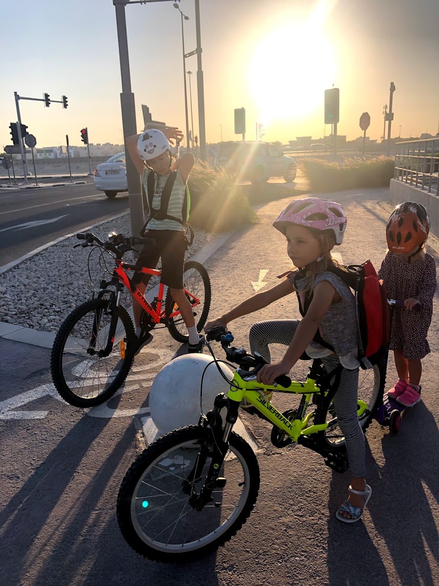 No a kola! Zlatý kola. Děti jezdí po compoundu (kolem dokola je to asi kilometr a půl, ale nejlepší je, že ty velký už nemusí nikdo hlídat a nahánět!!). Jezdíme i okolo našeho bloku, přímo od brány máme 5km cyklookruh, které teď budují v Kataru všude v obytných čtvrtích a mezi nimi. A pak pro cyklisty jsou otevřené i parky nebo dovednostní stezky. Možností je mnoho! Vozidel máme taky dost :).