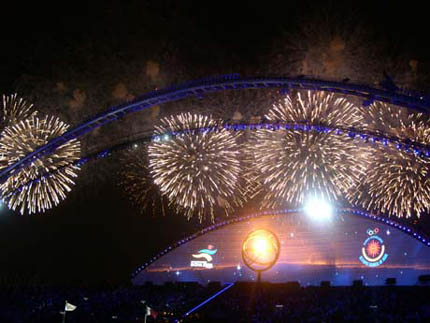 Nakonec jezdec zapálil nádobu uprostřed kovového kruhu, která začala stoupat vzhůru. K překvapení všech se ale kovový kruh začal rozevírat až kolem ohně vytvořil několik rotujících os. Oheň se zároveň rozžehl také na Pochodni, kde je opravdu vidět z většiny míst ve městě a dává vám pocit, že jste opravdu při tom. Celý ceremoniál zakončil obrovský ohňostroj, snad ještě působivější pro lidi mimo stadion (a samozřejmě pro televizní kamery).