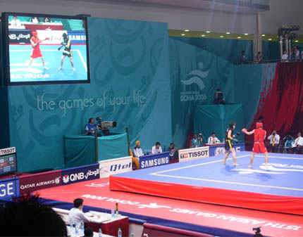 Wushu (Sanshou – souboj). Trošku nás to zklamalo, protože to byl prakticky kickbox. Ale cvičení s nářadím jsme bohužel stihli pouze v televizi.