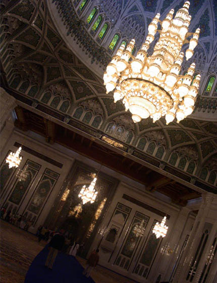 Největším highlightem Muscatu je podle mě Velká mešita. Je to nový náboženský komplex, který dal vystavět sultán Qaboos před 5 lety. Stavba kombinuje ománskou tradiční architekturu a islámské prvky – hlavní mešitu tak obklopuje 5 věží symbolizujících 5 pilířů islámu (to asi znáte: víra v jednoho Boha, haj neboli pouť do Mekky, dodržování Ramadánu, zakkát – příspěvky chudým a dodržování pěti modliteb denně). Velká mešita má taky několik nej, což má arabský svět vůbec rád. Vejde se sem 16 000 věřících, je zde instalován největší lustr (vyrobený v Íránu) a největší koberec (tkaný ručně 600 ženami po dobu 5 let, a to na místě).