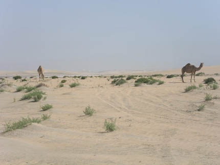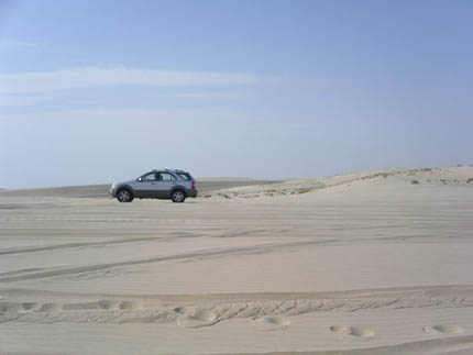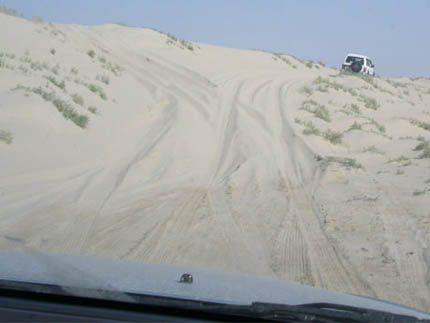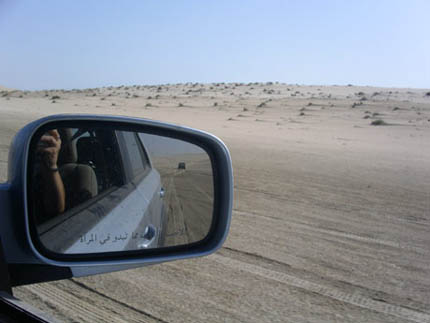 Sraz v 1 na benzínce na Wakru. Pět minut tam a 10 minut tady, v 1:40 jsme tam byli jako na koni – ostatní trpělivě čekali, protože asi věděli, že vezeme všecko jídlo. Zpoždění je ale blbá věc tak jako tak, takže jsme dotankovali hektolitry po čtyřech korunách šedesát a tryskem na konec světa. Tj. k Sealine Beach Resortu, kde končí silnice a dál se musí přes písek. Dost jsme sfoukli kola, přivázali celý náklad, přeřadili z automatu na manuál a hurá na to. Naše Sorento bylo v poušti poprvé, takže taková trošku zkouška ohněm – ehm, pískem.