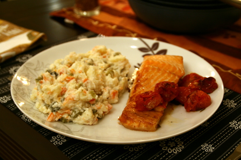 Druhá várka bramborového salátu a opět jiný recept na rybu pro Ivana – s tymiánem a rajčátky. Ještě jsem ho na tu pečenou mrkev s dýní a celerem neukecala :).