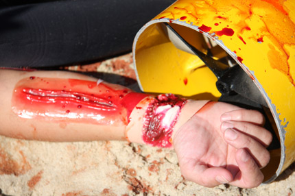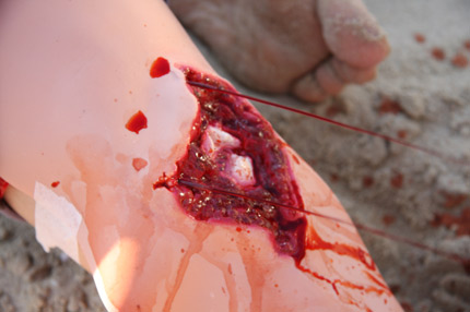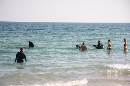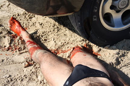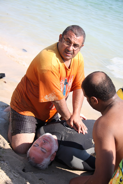 3. Žralok a infarkt. Nedaleko od břehu se objeví velká žraločí ploutev, výkřiky, panika, krev! Odháníme žraloka a taháme lidi z vody, 2 z nich jsou naši potápěči. Jeden z nich má ošklivě pokousanou nohu, poskytujeme první pomoc a voláme sanitku. Jeho buddy si stěžuje na bolest, která mu vystřeluje do prsou a levé ruky. Informujeme sanitku, že poveze pacienta s tržnými ranami na noze a ještě jednoho s podezřením na infarkt. Pro toho musíme narychlo sehnat další auto, které se nám nakonec zasekne v písku. Délka trvání asi 10 minut. Akce s křikem a žraločí ploutví zastaví s úžasem pár kolemjdoucích, děti se ještě chvíli bojí do vody. (Dřevěnou “žraločí” ploutev má samozřejmě na zádech přivázanou jiný potápěč).