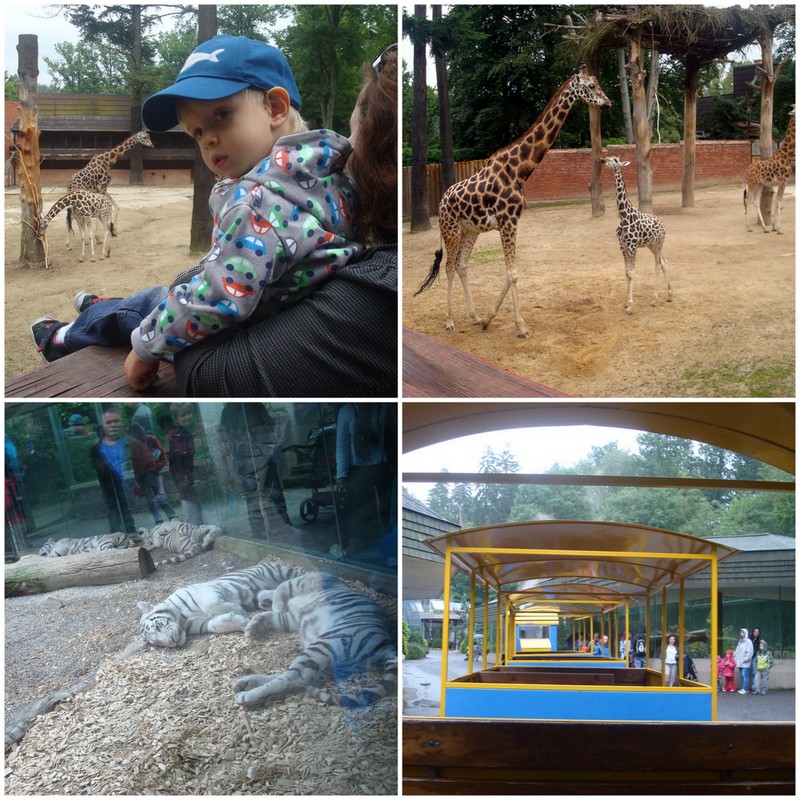 Pěkná byla i tradiční návštěva zoo (i když taky lilo). Nejvíc se asi líbily žirafy, kterým jsme z voka do voka koukali v zimě zevnitř jejich pavilonu a teď z venkovní vyhlídky. Mají jich v Liberci osm a stydlivé moc nejsou. Parádní je taky krmení lachtanů, bílá tygřata a slonice. Theuška vypráví, jak “soník vysypal písek si na zádíčka. A na havičku.”