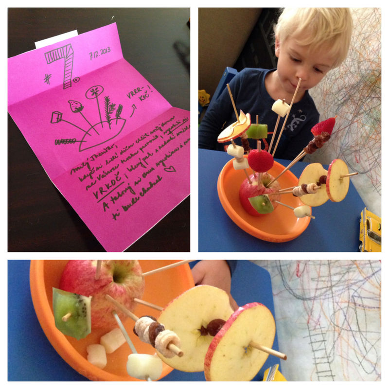 7. Výroba vrkoče. Navrátili jsme se do dob dávno minulých a abychom si provoněli byt (a taky pochutnali), vyrobili jsme vrkoč (“nežeknu”) ze samých dobrot – jablek, rozinek, jahod, kiwi, sýra, křupek… který rovnou posloužil jako moc dobrá snídaně :).