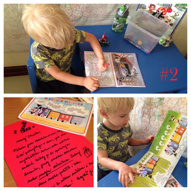 2. Dárek: omalovánka O veselé mašince. Tu jsem našla náhodou někde v knihkupectví, ale protože Theuška zatím není žádnej malovací ani vybarvovací fanatik, tak ležela pro budoucí použití v šuplíku. Je udělaná přesně podle knížky, kterou často čteme, což už si teď hezky uvědomil a dokonce do ní i občas něco načmárá.
