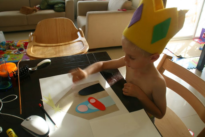 Naštěstí jsme si dnes spravili náladu. Vystříhala jsem Theuškovi fragmenty Betléma, které jsme pak uspořádali na velkou čtvrtku a Theuška je polepil a pokreslil. Moc pěkný! K tomu jsem mu ještě vyrobila královskou korunu a povídali jsme si o tom, jak se kdo jmenuje, kdo u toho byl, co je to kometa a proč má kráva vemínko :-D.