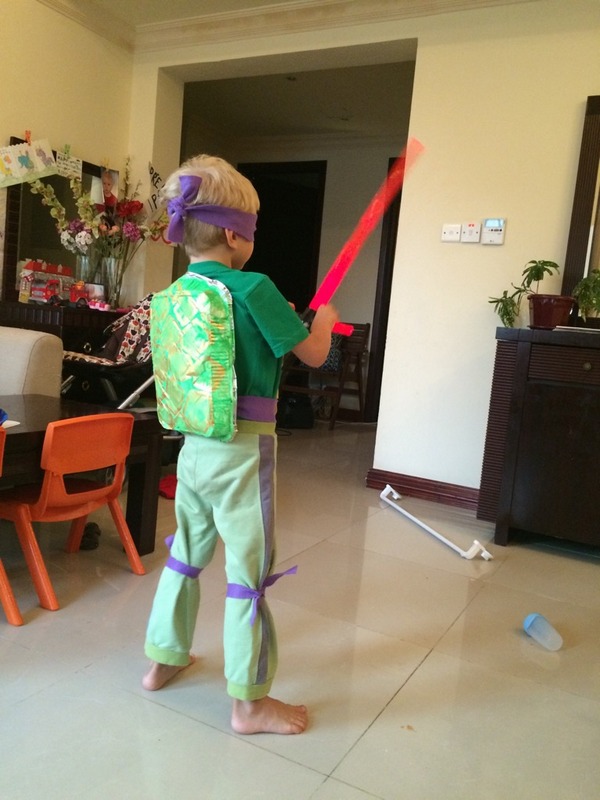 Dokonce to mohl být nejlevnější kostým století, takové zlaté tele DIY :-)! Staré tepláky, půjčené tričko a pár kousků filcu z domácích craftovacích zásob. Nojo, jenže Donatello nemá meč a bojovat nějakým dlouhým klackem je pod Theovu úroveň ![]()