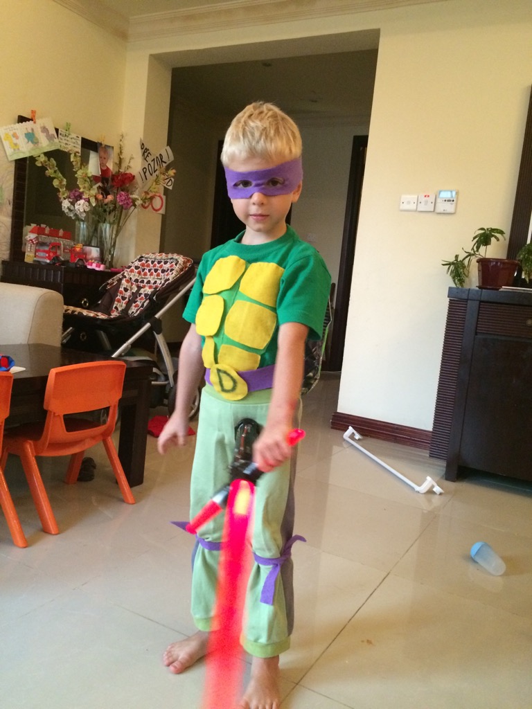 Letos tedy chtěl jít Theuška za Ninja želvu. V létě viděl myslím tak 5 dílů kresleného seriálu a hrozně ho to uchvátilo. Asi pochopitelně, kluk prostě. Neví, kdo je kdo, asi ani v zásadě o co tam jde, proč jsou to želvy, ale to je všechno vedlejší. Jsou to bojovníci a vyhrávají!