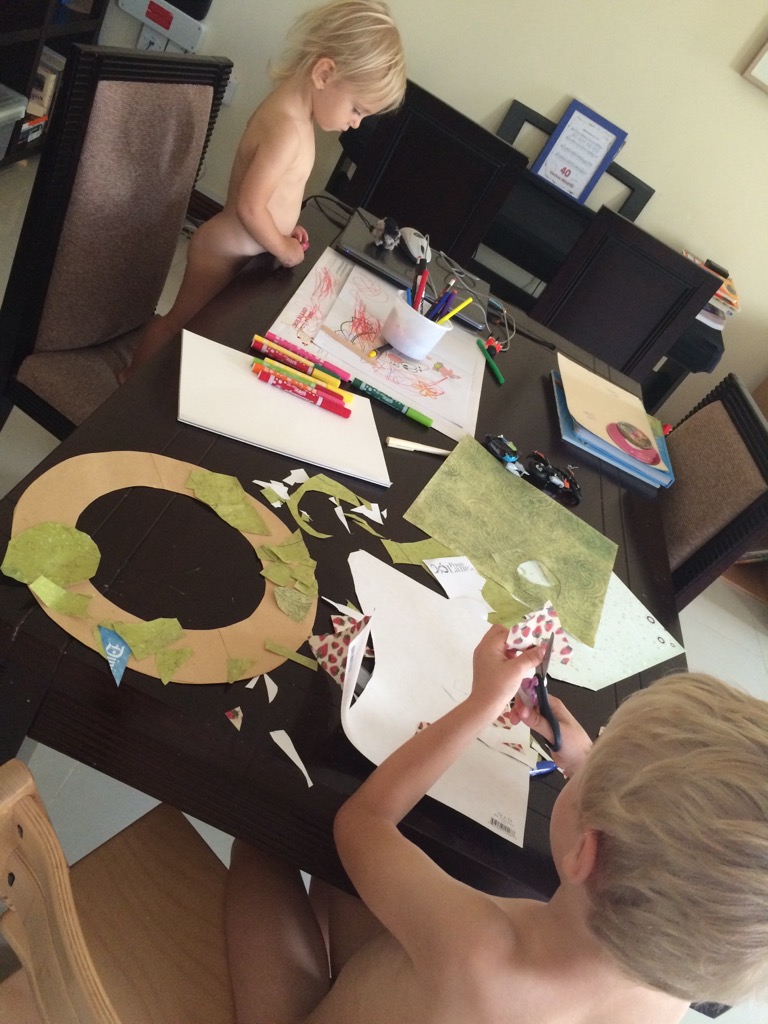 Adventní věnec se letos termínově do kalendáře dostat nepodařilo, takže jsme se pro nastartování vánoční atmosféry výzdobou rozhodli vyrobit něcojako věnec na dveře a něcojako vánoční hvězdy. Pro vánoční věnec Theo nastříhal ze scrapbookového papíru (díky Doha Home Educators a rotaci tvořicích potřeb) náhodné kusy, které pak nalepil na připravené papírové kolo. Easy peasy, trénink stříhání a práce s lepidlem, a dost se mu to povedlo!!