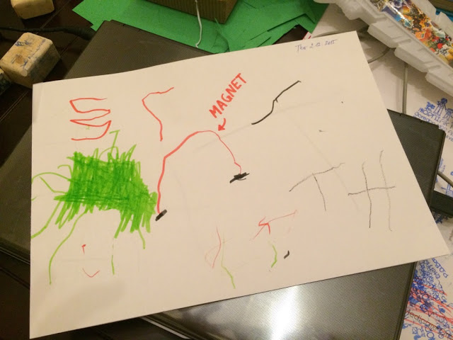 Měla jsem dvě takové ideje – chápete, backup :-D. Nakreslit obrázek a vystřihnout ho. A pak provlíkací obrázek. Jak si opravdu neberu úroveň Theuškových prací osobně (ani v negativním, ale ani v pozitivním smyslu), použít se nakonec nedalo nic :-D. Obrázky asi směřovaly dobrým směrem, ale záhy je rozstříhal na maděru! Provlíkací obrázek se zase tak zašmodrchal, že ho musel taky rozstříhat a rovnou to vzal i s celým klubkem vlny :-D. Holt ale cesta je někdy cíl a někdy ani po celodenní práci není co ukazovat. Nakonec jsme vyrobili o dva dny později něco jiného, se Sárčinou pomocí a docela efektní, musím říct, a už to máte někteří na cestě :-).