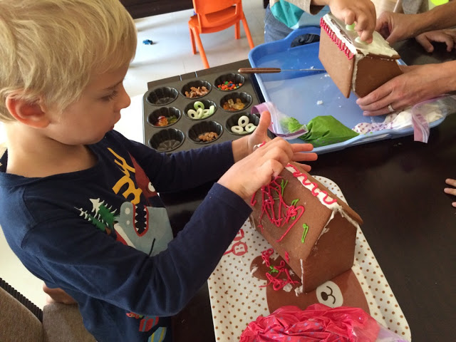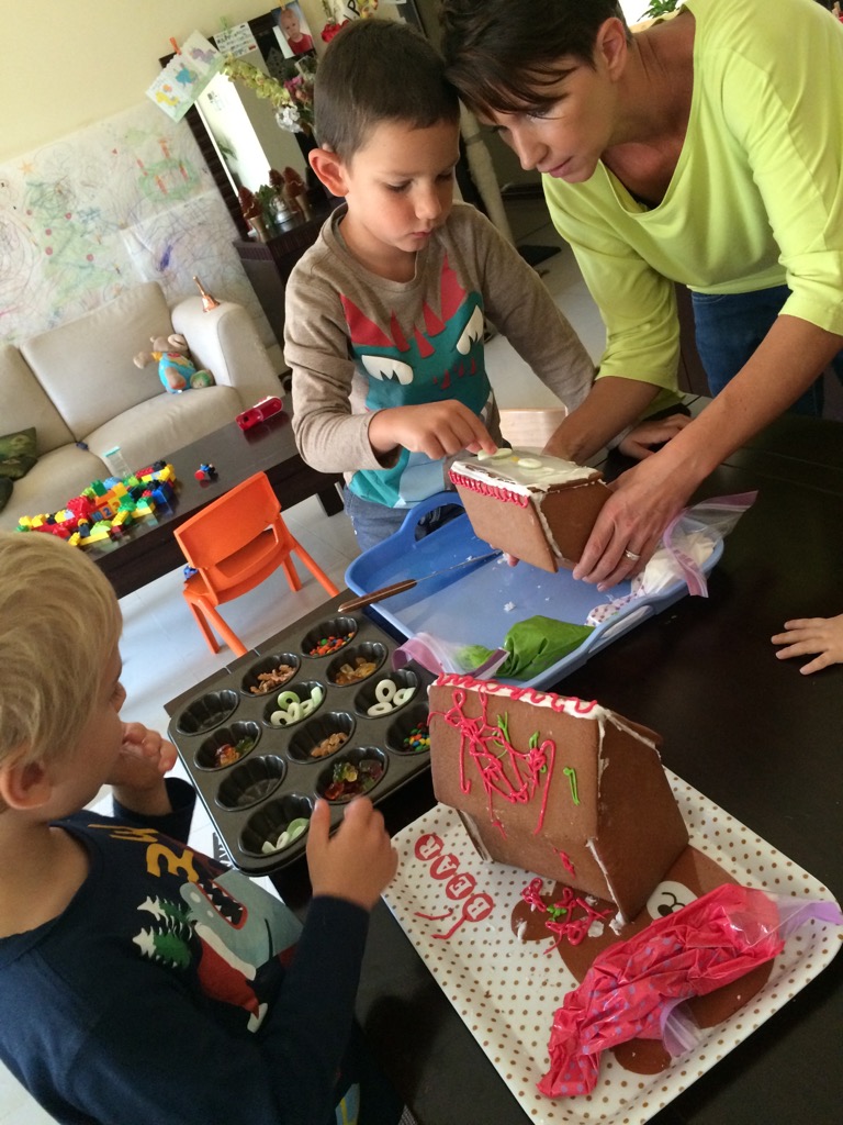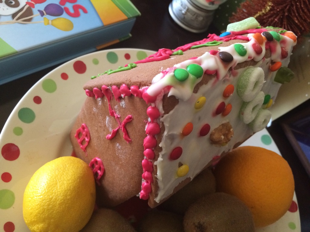Těsto jsem si připravila už v sobotu, péct jsem proto mohla podle okolností buď v neděli nebo v pondělí (backup backup backup), což se nakonec i stalo. Všechna čela dvou velkých chaloupek jsem napoprvé spálila. Ze zbytku těsta jsem udělala nová čela a střechy, ovšem nezbylo na stěny, pro které jsem vyráběla novou dávku těsta. O půlnoci bylo dopečeno, a že se ráno rozhodnu, jestli to budou kluci zdobit slepené nebo placaté. Lepší bude slepit, rozhodla jsem. Když jsem chaloupky slepila, OBĚ se mi rozpadly :-D.