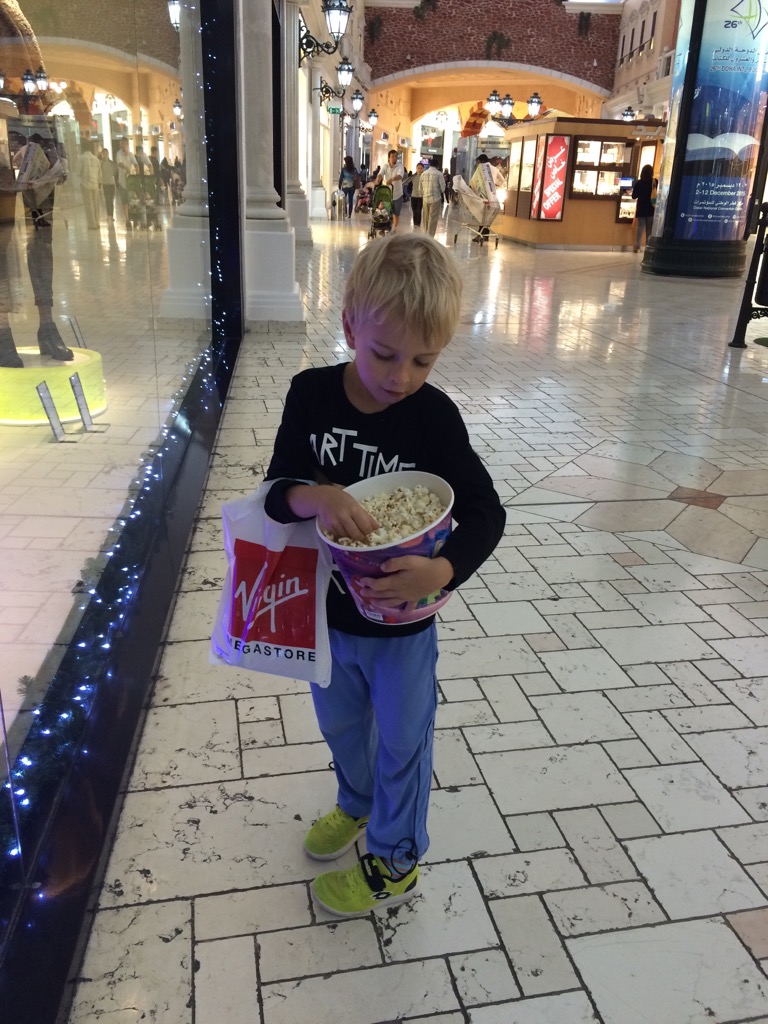 Letos byla naprosto skvělá! V Kataru se jedná spíš o takovou společnou akci Čechoslováků, kdy se děti sejdou, připravíme pro ně hry a zábavu, než za tmy dorazí Mikuláš s ansámblem – krásným andělem a strašně laskavým čertem :). Byl požadavek, aby děti starší batolecího věku NĚCO předvedli. Vědoma Theova ostychu jsem se z něho snažila vydolovat, jaký má plán – chtěl zpívat Horolezce od Ivana Mládka :-D. Pro jistotu jsme ještě to ráno vyrobili obrázek (backup backup backup)… který ovšem (chvilka napětí) záhy rozstříhal na maděru :-D. Takže Horolezci, nebo nic! Když první chlapeček zazpíval do mikrofonu Skákal pes, Theo změnil repertoár a že teda taky Psa. Cokoliv, synu! A když přišel na řadu, vzal do ruky mikrofon a byť přilepený na mně (na druhém rameni klíště Sárunka) ho fakt zazpíval! Zasloužená koleda. A s tím ostychem to nebude tak strašný, stačí ho trooošičku podpořit.