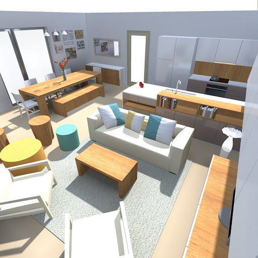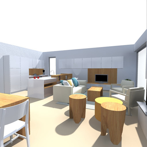 V rámci tendru jsme samozřejmě nezabíhali do úplných detailů, takže slovo finální berme s rezervou. Ale dostatečně je zde vyřešeno umístění a tvary nábytku, rozmístění detailů v kuchyni a další elementy důležité pro rozhodování. Velká pracovní plocha v kuchyni, možnost servírování jídla z kuchyně přímo na stůl, v jídelně praktický příborník vedle (na naše přání) velkého rustikálního stolu a zajímavě řešené sezení v obýváku s výhledem do zahrady i u okna v ušácích.