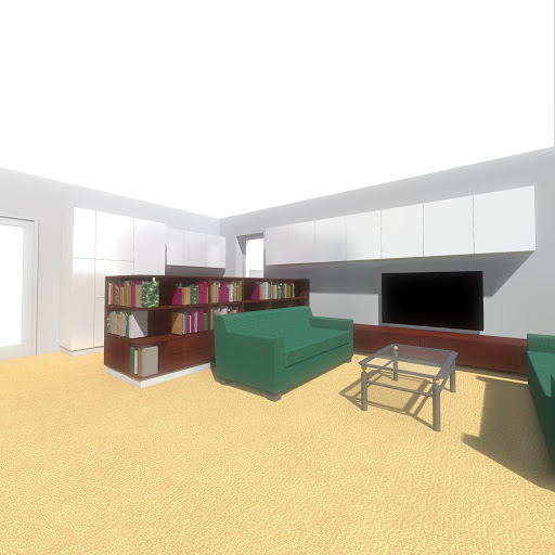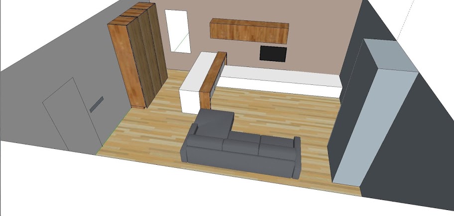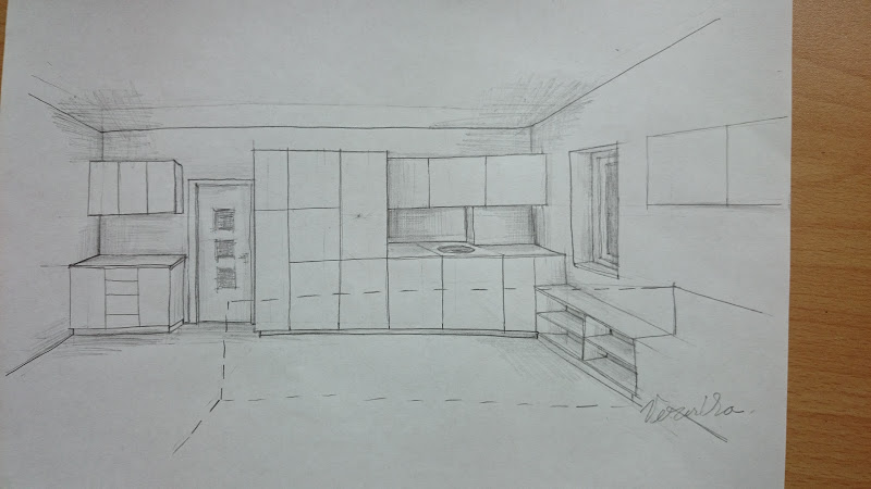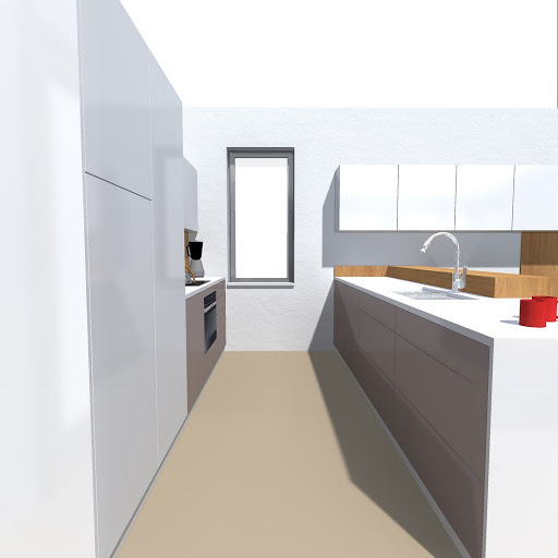 Nějaký začátek nebo konec kuchyně byl vzhledem k dokončenosti přívodů vody a kanalizace u malého okna poměrně zřejmý. Toto malé okno vám bude mj. dobře sloužit při orientaci v pohledech použitých na návrzích. Kuchyně se tedy měla vejít do “rohu” u okna, ať už pak povede jakýmkoli směrem.