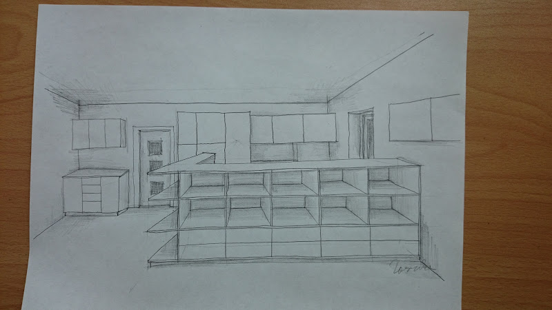 První úvahy o tom, že by se doprostřed místnosti udělala například zeď s vestavěnou lednicí se nakonec na papír ani nedostala. První návrh ale ukázal stále patrný záměr výrazného oddělení obývákové části od kuchyně. I tady se spontánně objevily dvě paralelní linky, ta na stěně však byla uspořádána obráceně – s vysokými skříněmi u dveří, což více otevřelo prostor u okna. Nápad umístit na zadní stěnu dřez už byl v tuto chvíli zastaralý.