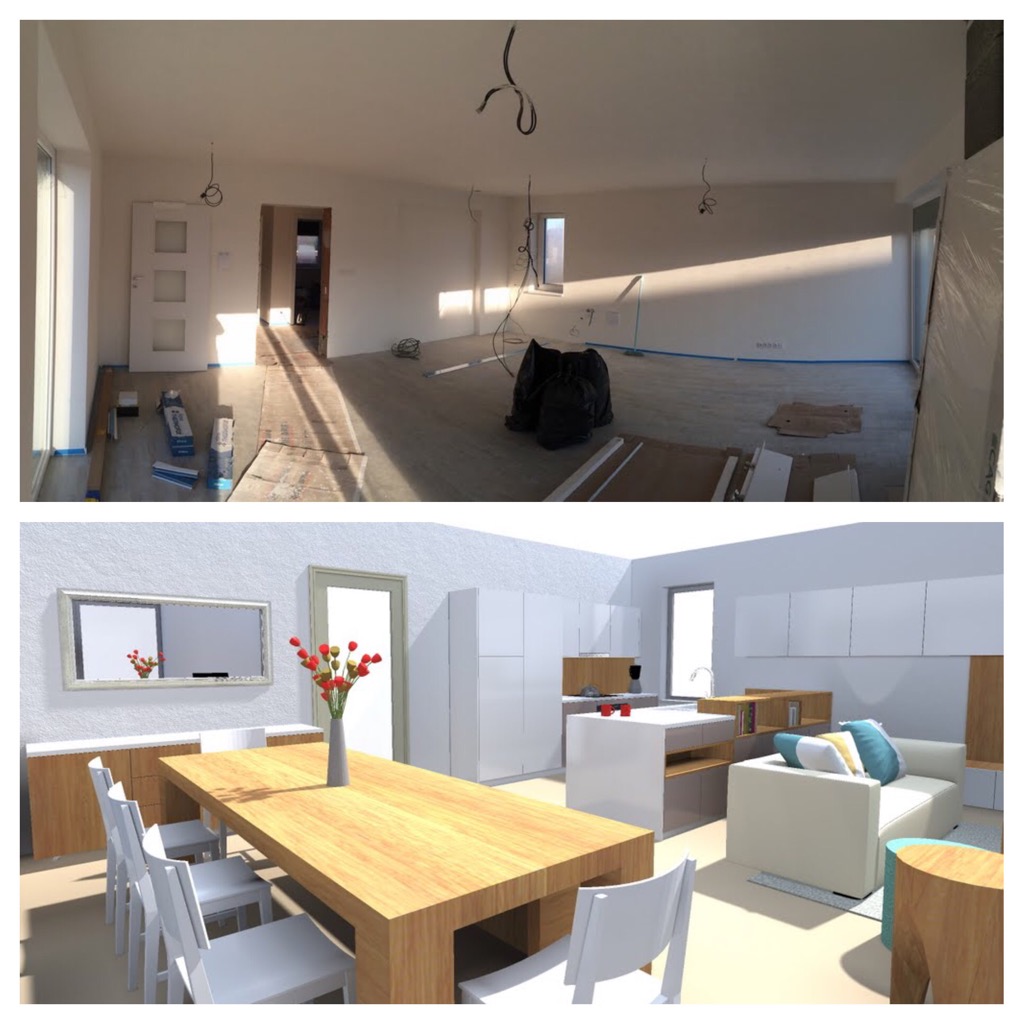 Jeden velký čtverec, dvě až k zemi prosklené stěny, ani jeden sloup – a do toho nějak smysluplně porovnat kuchyň, obývák a jídelnu. Pár domácností už jsme si vyzkoušeli, něco se osvědčilo, něco ne, ale konkrétní představu jsme pro tenhle prostor prostě neměli. A tak jsem si přizvali pomoc – dle doporučení dvě šikovné dámy – říkejme jim zatím paní Architektka a paní Designerka. Až bude práce hotová, obě vám ještě bude čas nad hotovým dílem představit.