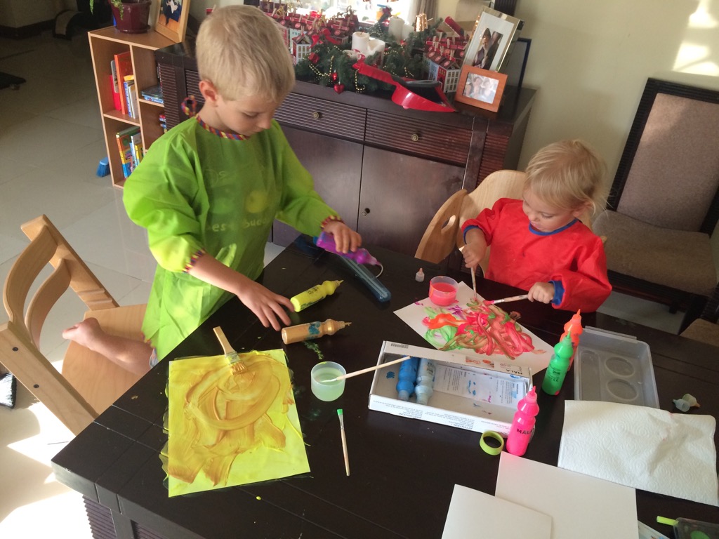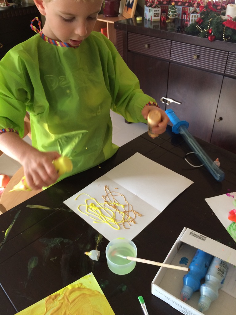 Vodovky už jsem asi zmiňovala, že jsou populární u obou dětí. Takže jsme zkusili malovat na jednu půlku čtvrtky a obtiskávat na tu druhou. A vycházelo to docela pěkně, trošku výtvarka s překvapením. Jinak je to dobrý projekt pod rodičovskou kontrolou, další dny, kdy se do toho pouštějí samostatně, až tak ne :-D.