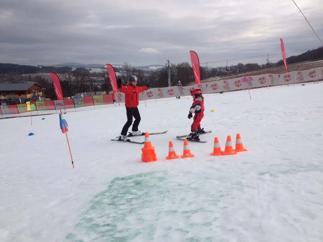Na první lekci s instruktorkou to vypadalo dost bledě… “Klouže tó!” hystericky se smál snad celou dobu, kdy ho vší silou držela na místě nebo nedejbože táhla na dětský vlek.