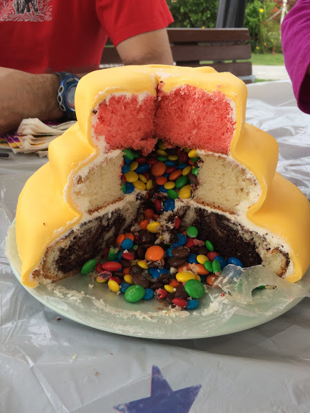 1. dubna jsme vystřihli oslavu pro oba dohromady s hrstkou malých kamarádů. Super den!! Zalezlo sice docela nečekaně sluníčko (na apríla, co byste čekali) a vodotrysky jsme si neužili, ale sami v parku s dobrým jídlem a hrami se to stejně povedlo. Dort byl třípatrový! Trojbarevný s extra překvápkem uvnitř.