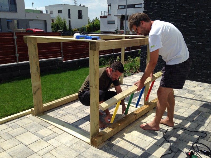 Lehce dohlížíme na budování kuchyně. No tak ne, no… my se u toho jen válíme a cákáme :), vooobčas se s námi něco konzultuje.