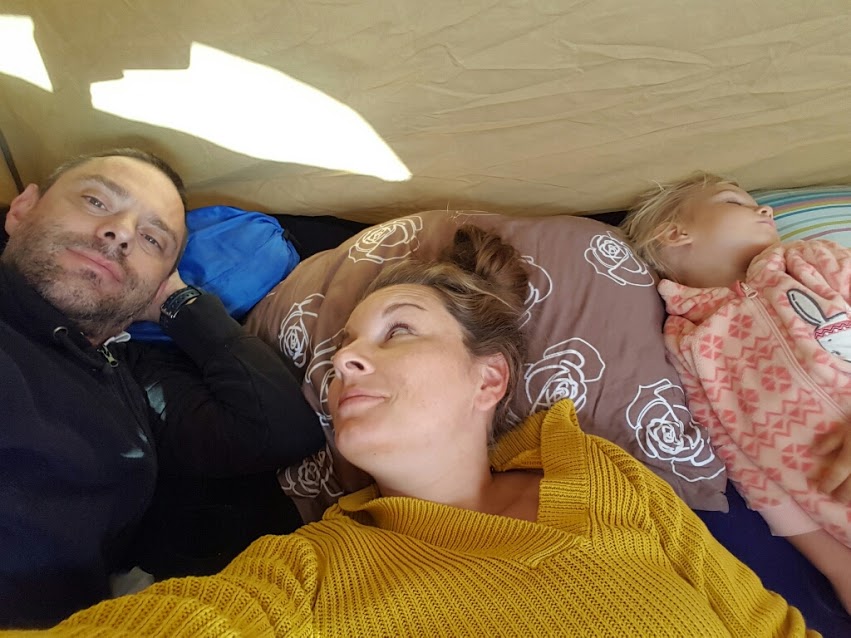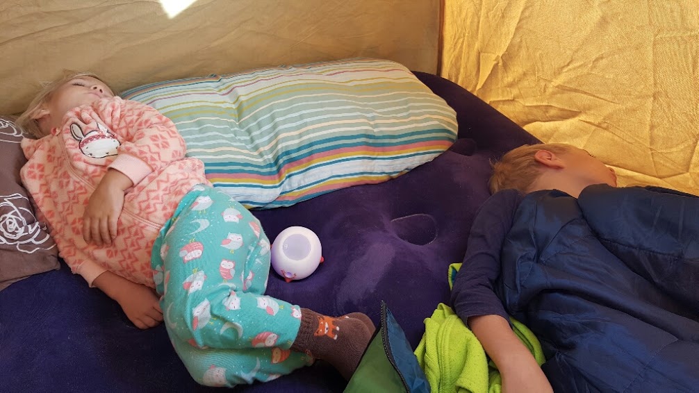 My ve stanu spíme! Na pořádných nafukovacích matracích, se 2 velkými polštáři, světýlky a spacáky, ale kempování to pořád připomíná :-)).