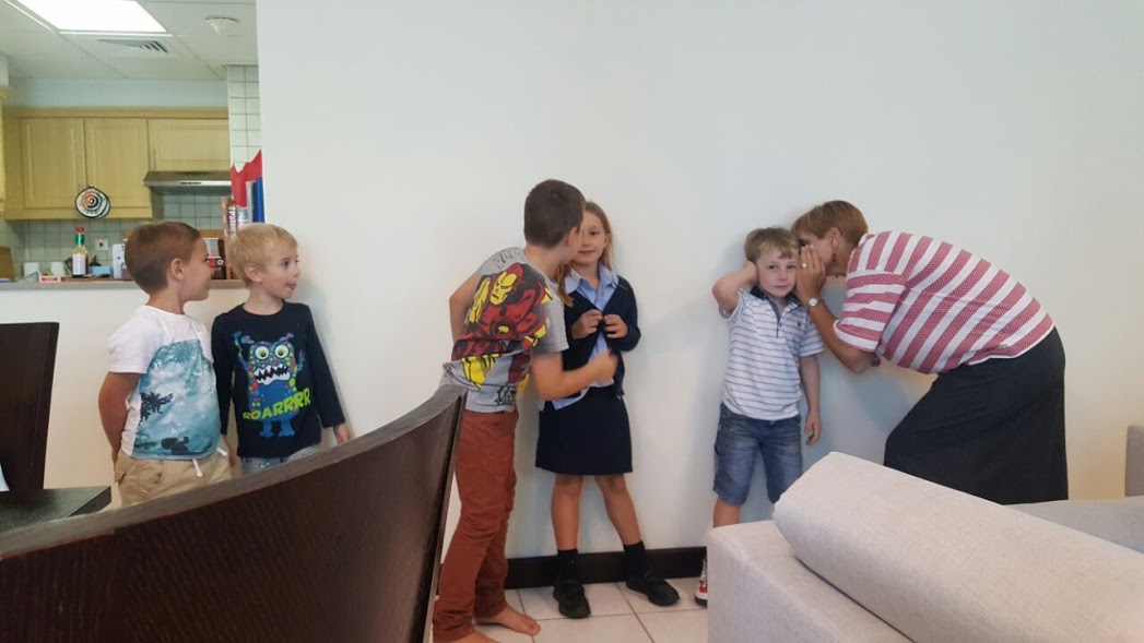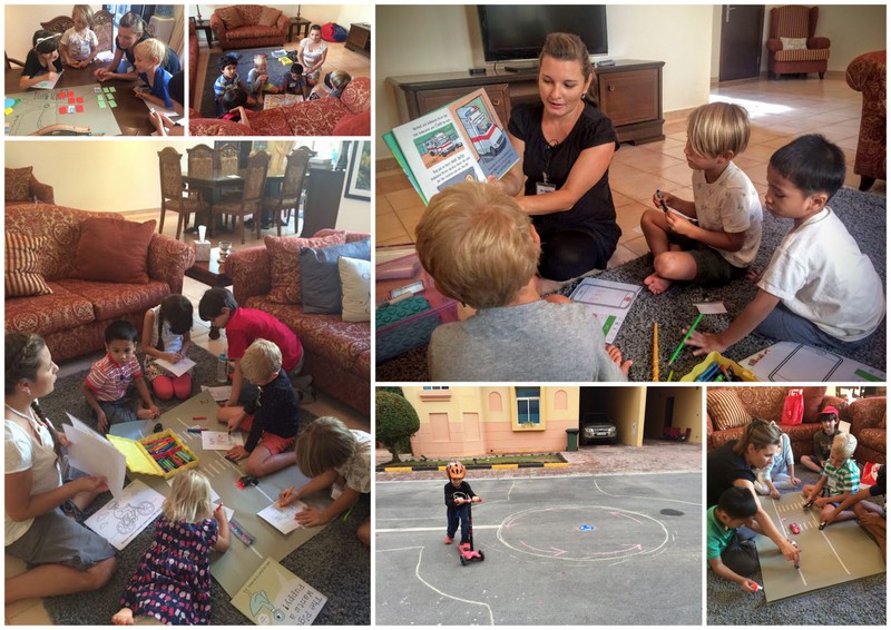 Theo se posunul ze skupinky “Littles” do “Youngers”, která zahrnuje děti 5-8 let. Kurzů měli na výběr přehršel (Lego Reading, Art Around the World, Science in the Kitchen, tělocvik…), reálně si vybírají dva. Theovi jsem vybrala “Stop! Look! Listen!”, protože to byla dopravní výchova, která ho momentálně nesmírně zajímá, a protože jsem ji učila já :-D. Probírali jsme značky, fungování semaforů, bezpečnost (helmy, autosedačky, airbagy, blinkry), první pomoc, orientaci v mapách a samozřejmě si střihli taky jednu praktickou hodinu na improvizovaném dopravním hřišti.