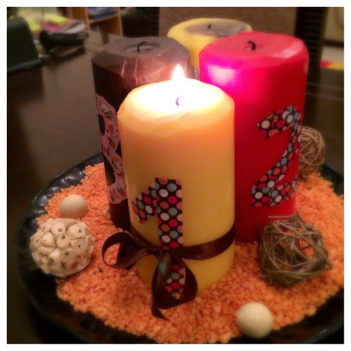 30. listopadu. Svíčky jsou recyklované z loňska, pouze jsme je polepili čísly a upevnili na talíři barevným pískem. No už jsem viděla horší :-D.